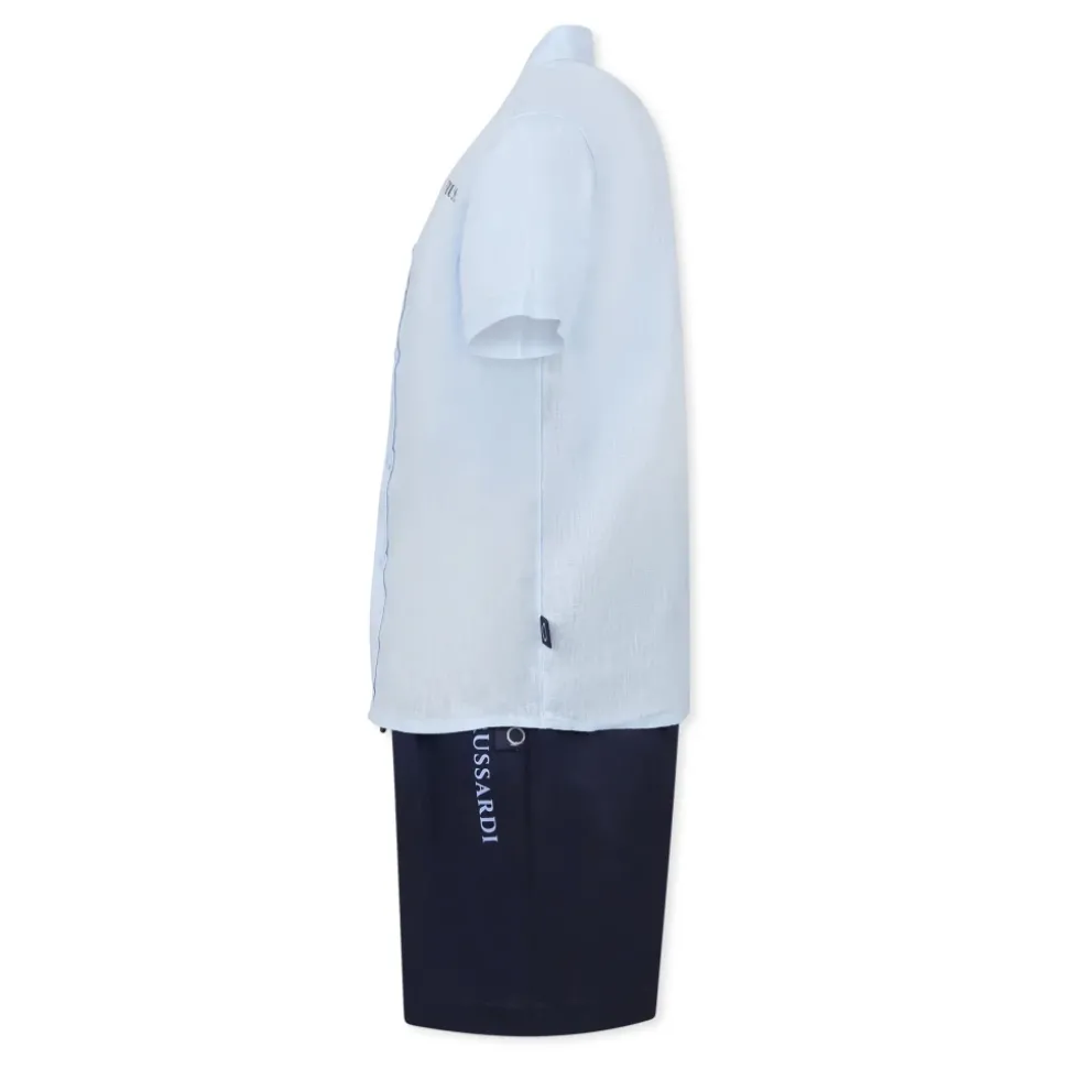 De Trussardi Completo Sportivo Set combineert ademend, lichtgewicht linnen met verfijnde tailoring voor warm weer, ideaal voor casual uitjes en informele evenementen. Belangrijkste kenmerken: Blauw | Azzurro | Linnen | Lichtgewicht | Ademend | Elastische tailleband op bermuda | Knoopsluiting aan de voorkant op het shirt | Gecoördineerde tweedelige set | Shirt met korte mouwen | Subtiel geborduurd logo op de borst | Effen kleurdesign | Afmetingen & pasvorm: Comfortabele pasvorm met elastische taille | Geschikt voor warme seizoenen | Samenstelling & verzorging: 100% linnen | Volg de wasvoorschriften op het label. Niet chemisch reinigen. Niet in de droogtrommel. Niet bleken. Gebruik een mild wasmiddel voor kleuren. Strijk op maximaal 110°C zonder stoom.