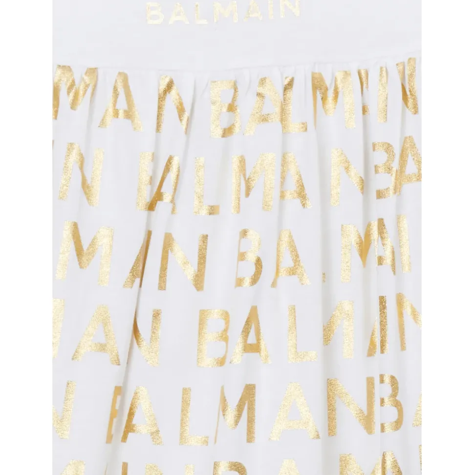 De Balmain Cotton Onesie and Beanie Set combineert een zachte katoenen jersey romper met een bijpassende beanie, beide geaccentueerd met gouden Balmain logo details. Belangrijkste kenmerken: Wit | Katoen | Onzichtbare drukknoopsluiting aan de onderkant van de benen | Inclusief bijpassende beanie | Geplooide elastische manchetten en halslijn | Gouden Balmain print | Klein gouden Balmain logo op de voorkant | Witte jersey beanie met gouden bedrukte Balmain logo | Fijne katoen jersey textuur | Samenstelling & verzorging: 100% katoen | Machinewas op 30°C.