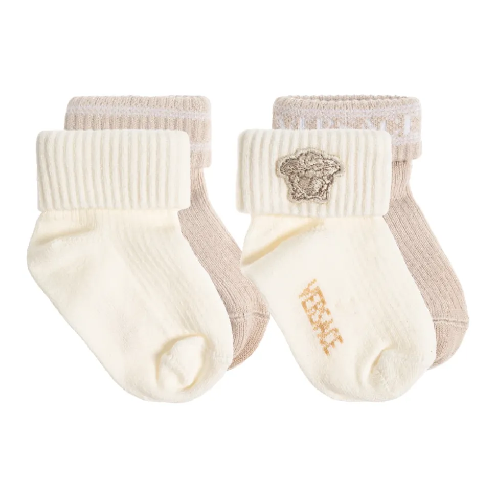 Versace Cotton Socks 2-Pack combine een zachte katoenen constructie met de kenmerkende Medusa- en Versace-logo borduursels voor subtiele branding en comfortabel dagelijks gebruik. Belangrijkste kenmerken: Beige | Crème | Katoen | Stretch | Zacht breisel | Omgeslagen boord | Ribgebreide boord | Inclusief geschenkverpakking | Geborduurde Medusa patch | Jacquard Versace logo | Minimalistisch design | Samenstelling & verzorging: 74% katoen, 19% polyamide, 7% elastaan | Borduurwerk: 100% polyester