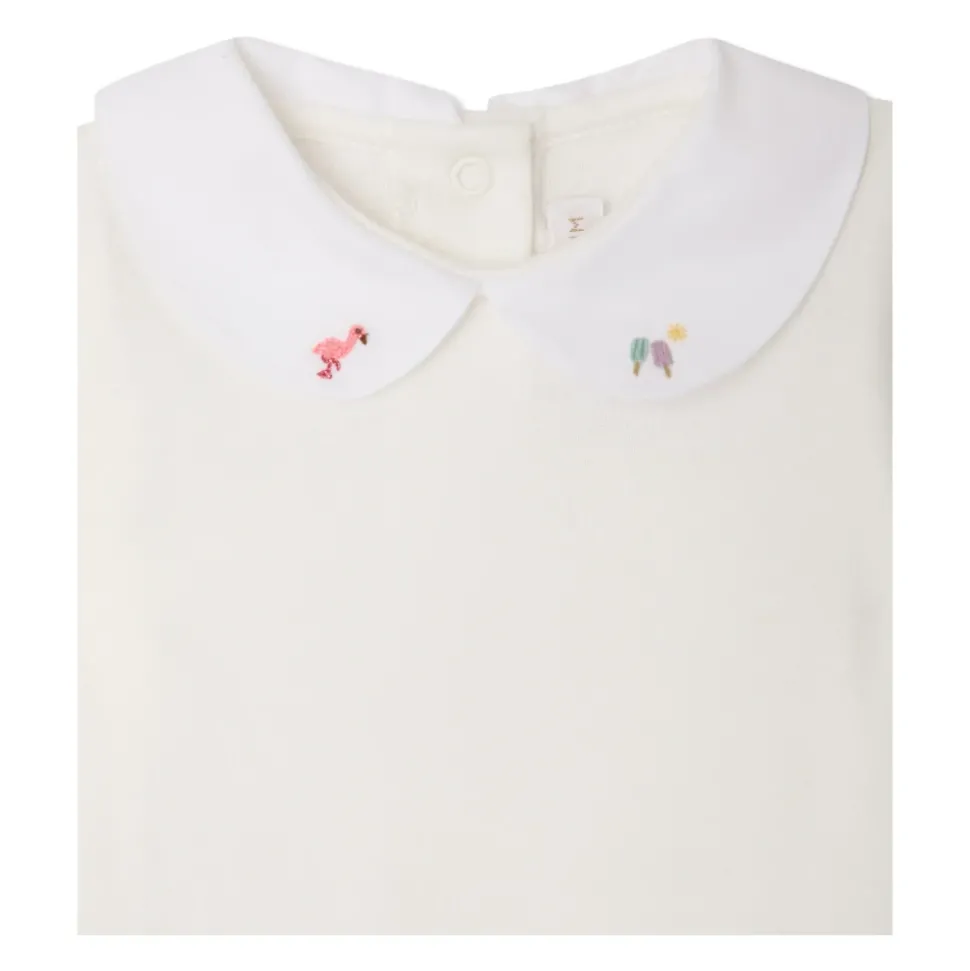 De Bonpoint Cygne Bodysuit combineert een klassieke Peter Pan-kraag met delicaat kraagborduurwerk voor een elegante bodysuit voor elke dag. Het benadrukt fijne afwerking en praktische drukknoopsluitingen voor gemakkelijk aankleden. Belangrijkste kenmerken: Wit | Katoen | Ademende stof | Zacht, aangenaam gevoel | Drukknoopsluitingen aan de achterkant en het kruis (binnenbeenlengte) | Verborgen drukknoopsluiting voor eenvoudig verschonen | Peter Pan-kraag met geborduurde flamingo en veelkleurige botanische motieven | Geschulpte/picot-rand | Lange mouwen | Samenstelling & verzorging: 100% katoen | Machinewas 30°C milde cyclus; niet bleken; niet in de droogtrommel; plat drogen in de schaduw; medium strijken; niet chemisch reinigen.