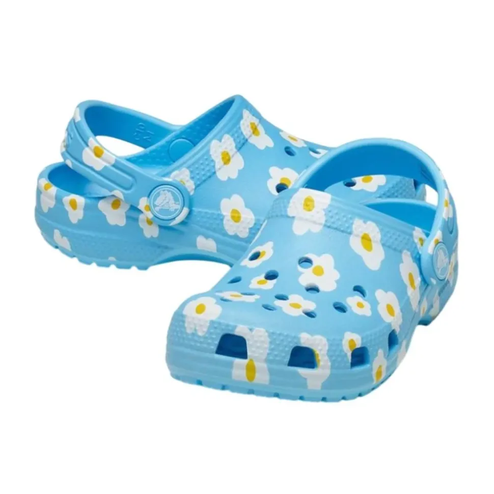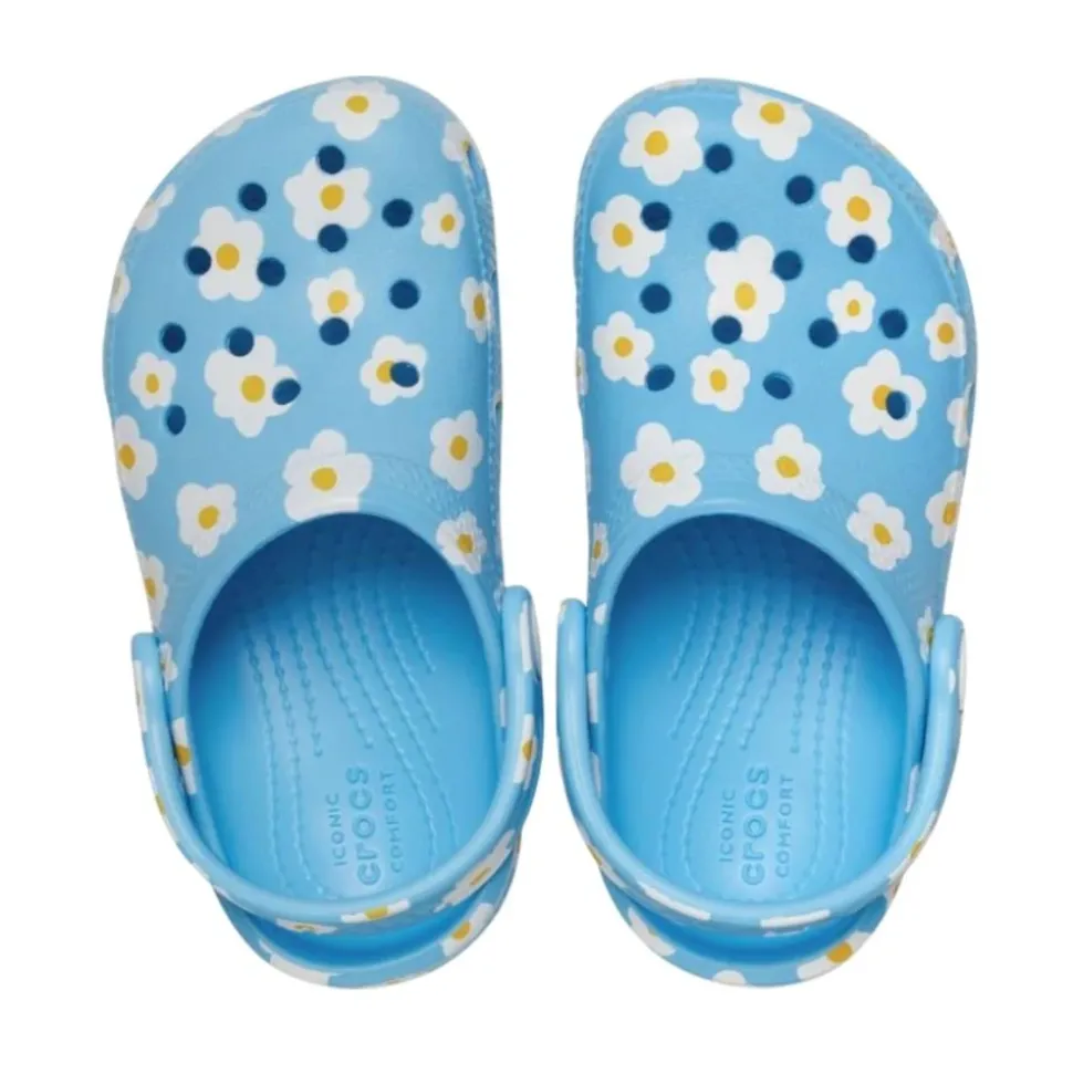 Bloemen, kleur en comfort bij elke stap! De Crocs Classic Daisy Clog sandalen komen in een prachtige blauwe kleur met een leuk madeliefjespatroon over de hele schoen. Perfect om te spelen, wandelen of van de zomer te genieten, ze zijn gemaakt van lichtgewicht, gewatteerd en gemakkelijk schoon te maken Croslite synthetisch materiaal. Het ontwerp met ventilatiegaten en een achterband zorgt voor frisheid en ondersteuning de hele dag door.