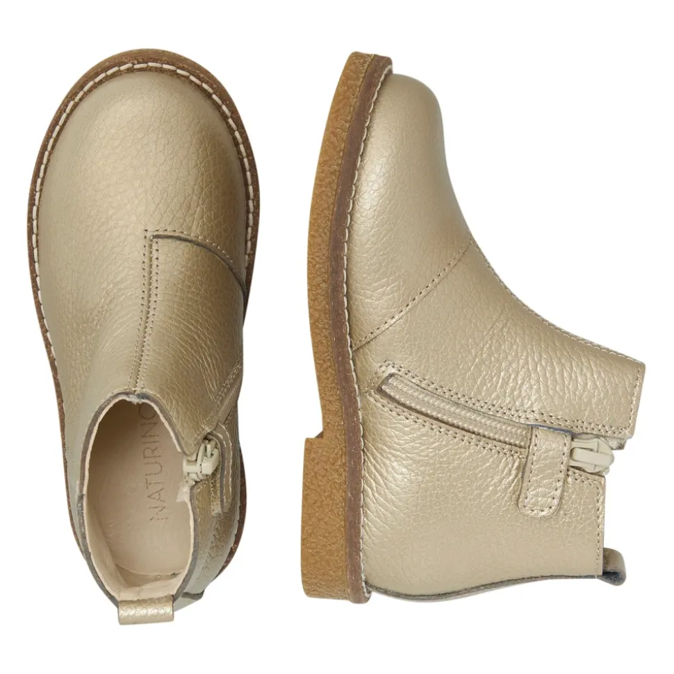 Naturino DASIE is een leren enkelboot met een platinum gelamineerd bovenwerk en een ritssluiting aan de binnenkant voor gemakkelijk aan- en uittrekken. Het combineert een leren voering en binnenzool met een rubberen buitenzool voor de winter. Belangrijke kenmerken: Platinum | Goud | Leer | Winterklaar | Ritssluiting aan de binnenkant | Leren voering en binnenzool | Rubberen buitenzool | Platinum gelamineerd leren bovenwerk | Enkelboot silhouet | Lage schacht, eenvoudige lijnen | Samenstelling & verzorging: Bovenwerk: Gelamineerd leer | Voering: Leer | Binnenzool: Leer | Buitenzool: Rubber