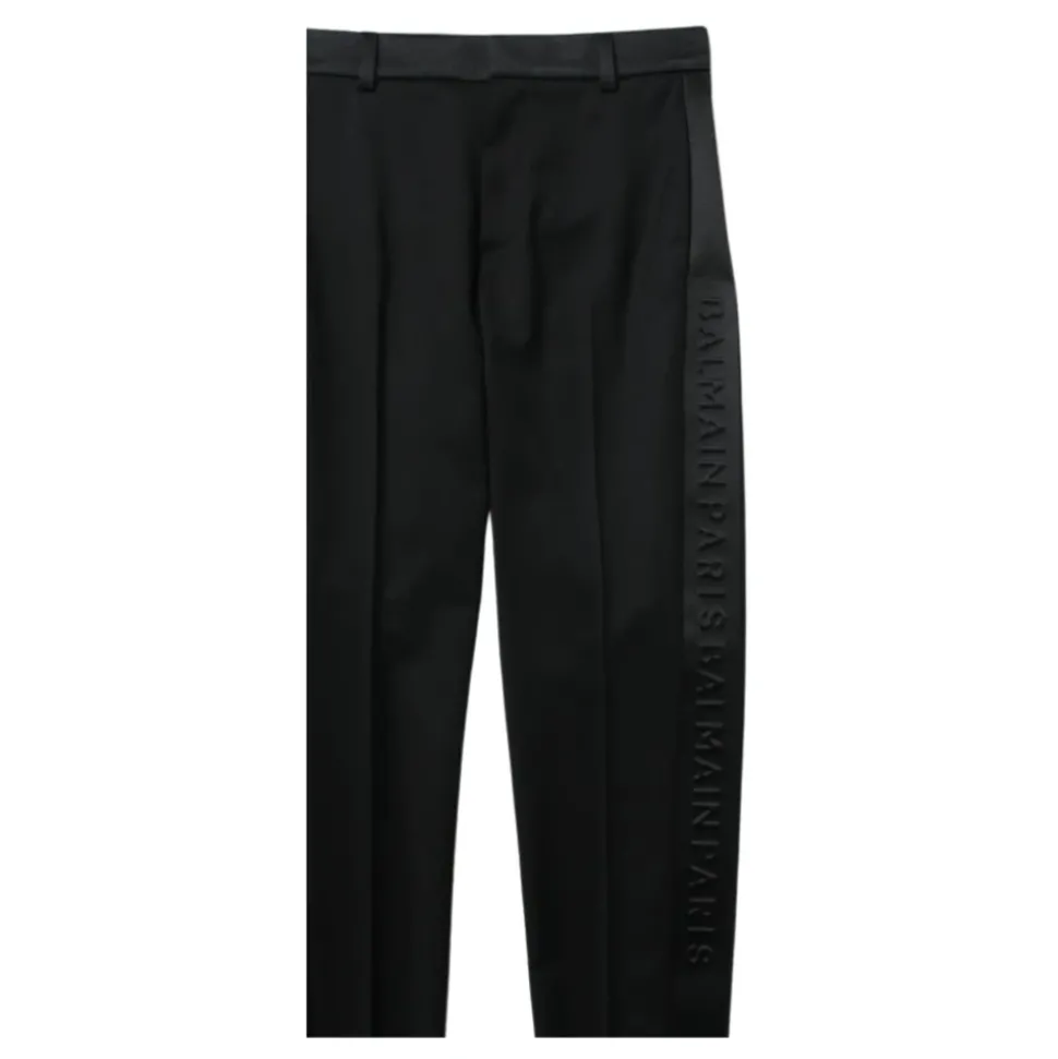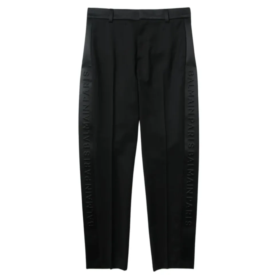 De Balmain Delnero broek heeft een hoge taille en een getailleerd silhouet, geaccentueerd met kenmerkende logo-strepen aan de zijkant voor een verfijnde, veelzijdige look. Ontworpen voor een verzorgde, alledaagse look, combineren ze strakke lijnen met praktische zakdetails. Belangrijkste kenmerken: Zwart | Nera | Scheerwol | Paspelzakken aan de zijkant | Achterzakken met split | Hoge taille | Logo-strepen aan de zijkant | Getailleerd silhouet | Afmetingen & pasvorm: Klassieke pasvorm | Hoge taille | Samenstelling & onderhoud: 100% scheerwol | Uitsluitend chemisch reinigen.