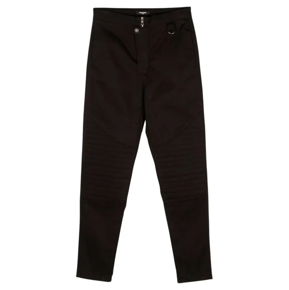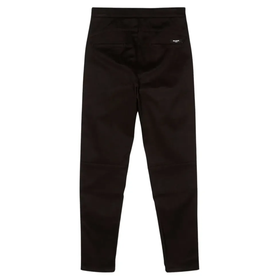 De Balmain Delnero Trousers combineren een high-waisted, stretch silhouet met kenmerkende knoop- en zilveren ring hardware voor een geklede, smart-casual look. Ontworpen voor verfijnde dagelijkse kleding en gemakkelijke styling. Belangrijkste kenmerken: Zwart | Katoen | Ritssluiting | Knoopdecoratie | Zilveren ring detail | Logo achteraan | Afmetingen & pasvorm: Hoge taille | Stretch fit | Samenstelling & verzorging: 98% katoen | 2% elastaan