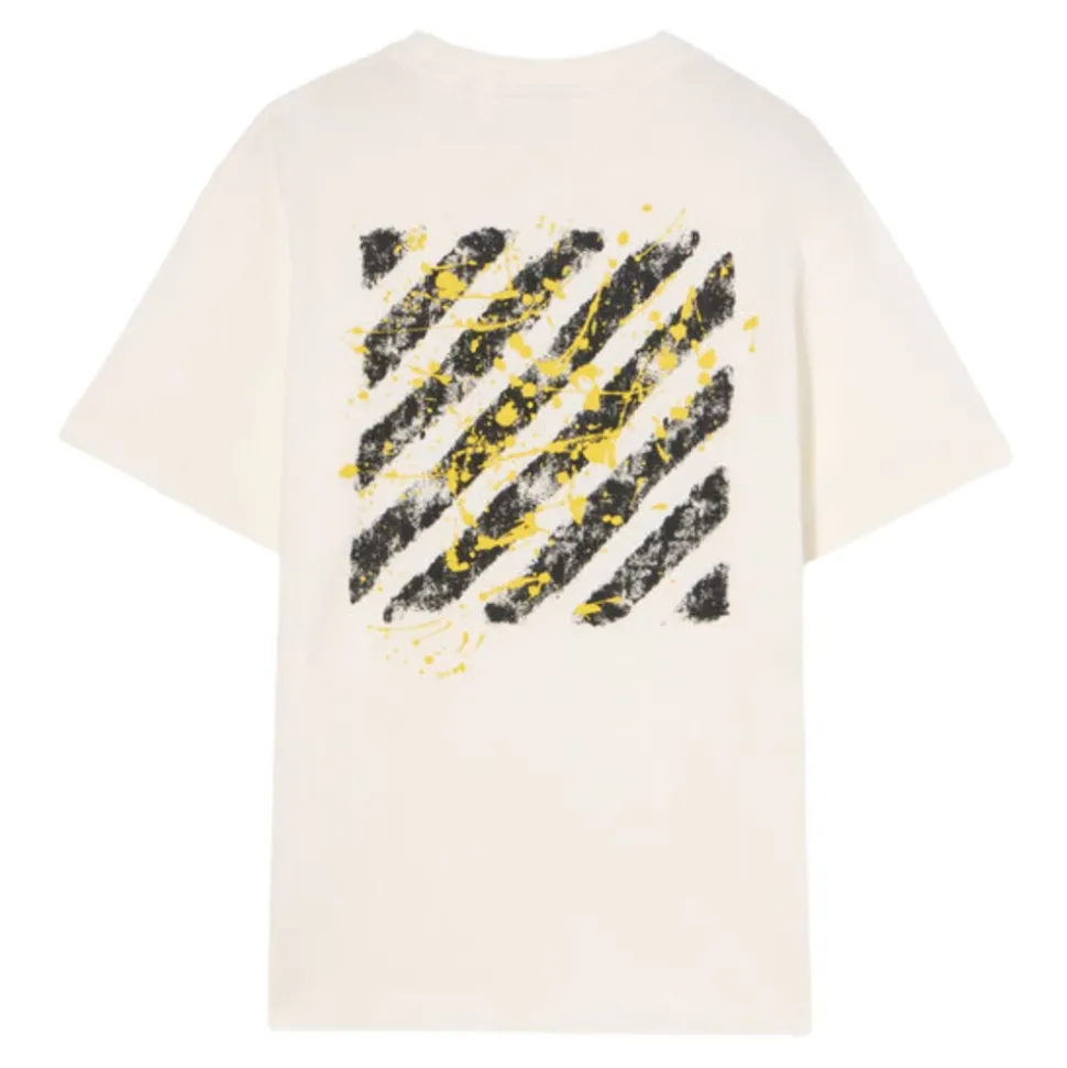 Off-White Diags Splat Tee S/S is een katoenen T-shirt dat opvalt door de opvallende ‘splat’ graphic op de achterkant. Ontworpen voor casual streetwear en gemakkelijk te combineren met jeans of laagjeslooks. Belangrijkste kenmerken: Off white | Wit | Geel | Katoen | Ronde hals | Korte mouwen | Rechte zoom | ‘Splat’ graphic op de achterkant | Geribbelde afwerking | Afmetingen & pasvorm: Valt normaal qua maat | Samenstelling & verzorging: 100% katoen | Rib details: 100% katoen