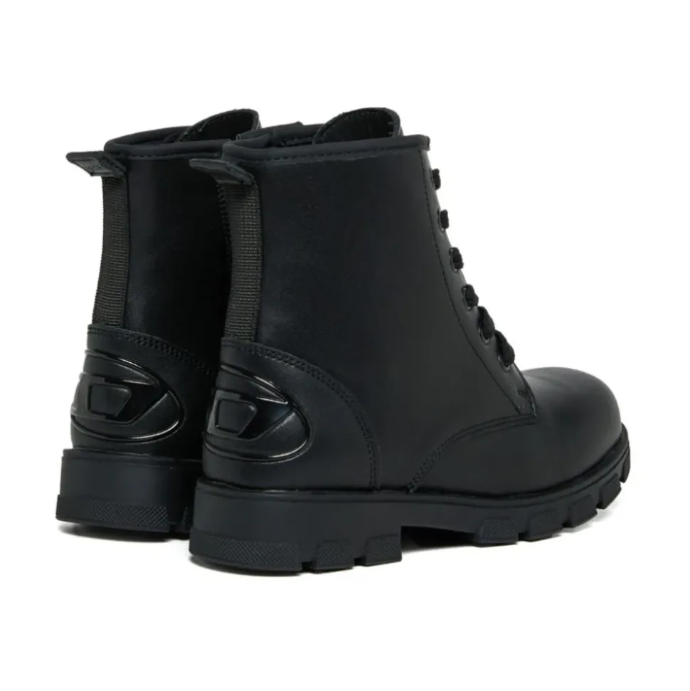 Diesel boots met een grove zool en gewatteerde kraag. Vetersluiting aan de voorkant en een logo detail aan de zijkant zorgen voor een stoere, street-ready look voor dagelijks gebruik. Belangrijkste kenmerken: Zwart | Vetersluiting aan de voorkant | Gewatteerde kraag | Grove zool | Logo detail aan de zijkant