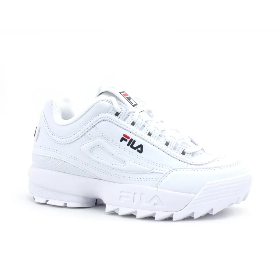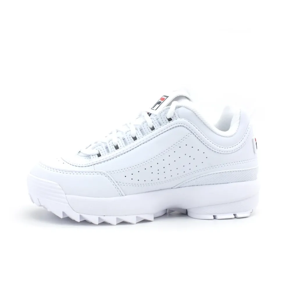 Fila Disruptor Kids sneakers combineren een gedurfd, chunky platformsilhouet met een leren bovenwerk voor een alledaagse streetwear-stijl en grip. Belangrijkste kenmerken: White | Bianco | Leer | Platform rubberen zool voor extra hoogte | rubberen buitenzool voor grip | Vetersluiting | Textiele voering | Ronde neus | Chunky platformsilhouet | Laag model | Afmetingen & pasvorm: Zool dikte: 3,5 cm | Totale schoenhoogte: 11,5 cm | Gewicht (kleinste maat): 218 g | Regular fit | Samenstelling & onderhoud: Bovenkant: Leer | Voering: Textiel | Zool: Rubber