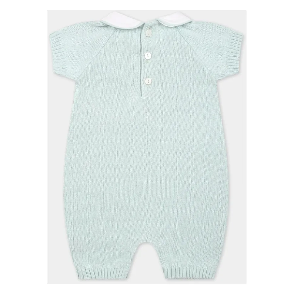 Kleed je kleintje in stijl met deze groene katoenen romper van Little Bear. Met een witte kraag met groene afwerking, korte mouwen, witte knoopsluiting op de achterkant en tussen de benen. Versierd met vlechtdetails aan de voorkant.