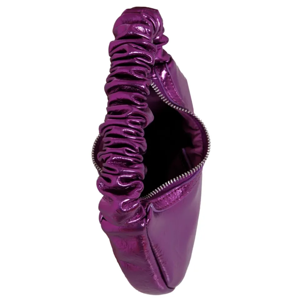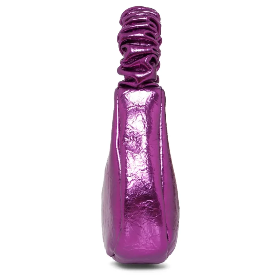 Verrijk de stijl van je kleine meisje met deze Molo-tas in gehamerd paars met een gekruld handvat, bovenritssluiting en afmetingen van 21cm x 15cm x 4cm. Gemaakt van 100% polyurethaan.