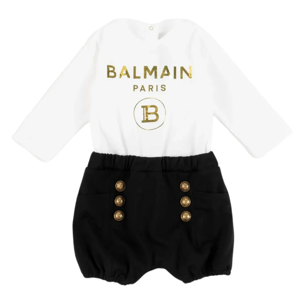 Maak kennis met de elegante Straw Jumpsuit met lange mouwen en geribbelde manchetten van Balmain. Deze stijlvolle jumpsuit, ontworpen voor meisjes, is perfect voor elke gelegenheid. Gemaakt van hoogwaardige cotone-stof, biedt het zowel comfort als stijl. Shop nu en laat je kleine fashionista stralen!