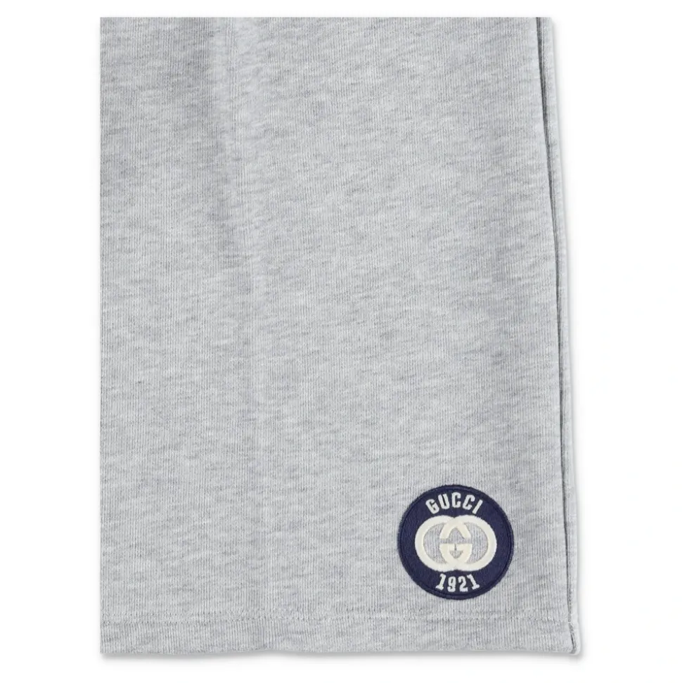 De Fleece Bermuda Shorts van Gucci bieden een stijlvolle en comfortabele optie voor casual wear, gemaakt van 100% katoen voor een zacht gevoel en een kwalitatieve afwerking. Belangrijkste kenmerken: Grijs | Katoen | Elastische tailleband | Gucci Interlocking G 1921 geborduurde patch | Gestreept inzetstuk | Afmetingen en pasvorm: Basketball fit | Samenstelling en onderhoud: 100% katoen | Machinewas koud, droogtrommel laag.