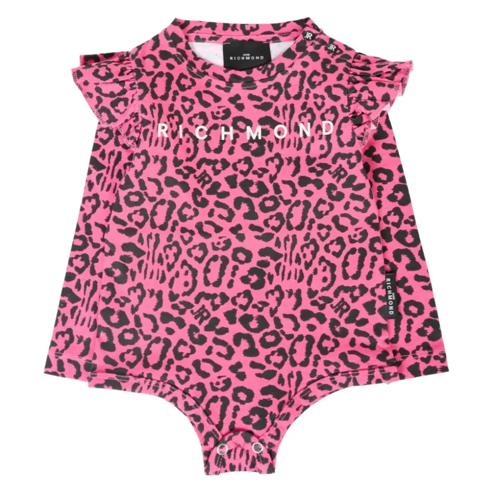 Kleed je kleine meid in stijl met deze fuchsia katoenen bodysuit van John Richmond met lange mouwen, een geribbelde ronde hals, gerimpelde schouders en drukknopen voor gemakkelijk aan- en uitkleden. Versierd met een allover dierenprint en een wit logo op de voorkant, is deze bodysuit zowel modieus als comfortabel. Gemaakt van 100% katoen, machinewasbaar op 30°C.