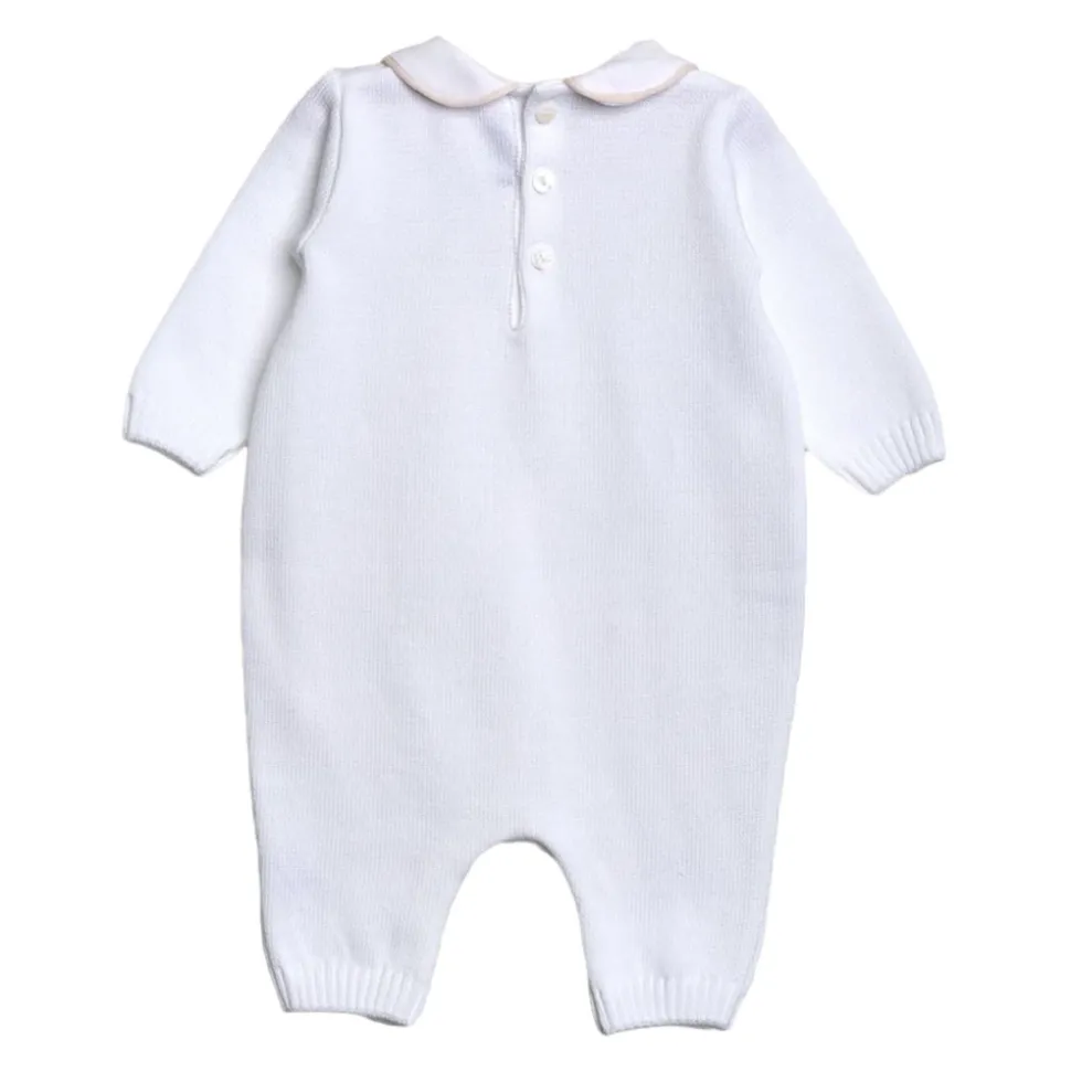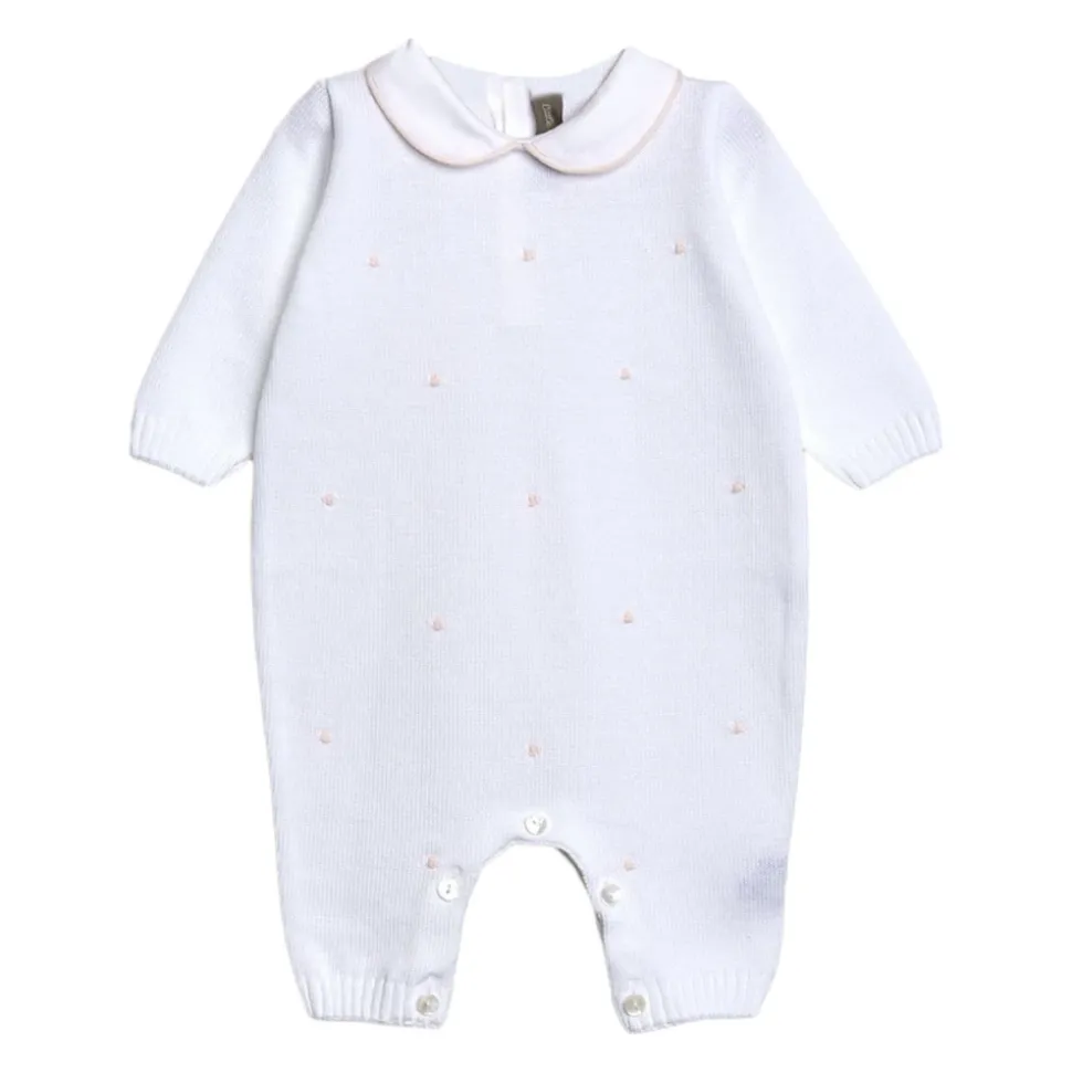 Little Bear katoenen jumpsuit met contrasterende geborduurde stippen in poeder. Profielkatoenen kraag. Perfect voor het bedritueel van je kleine meisje.