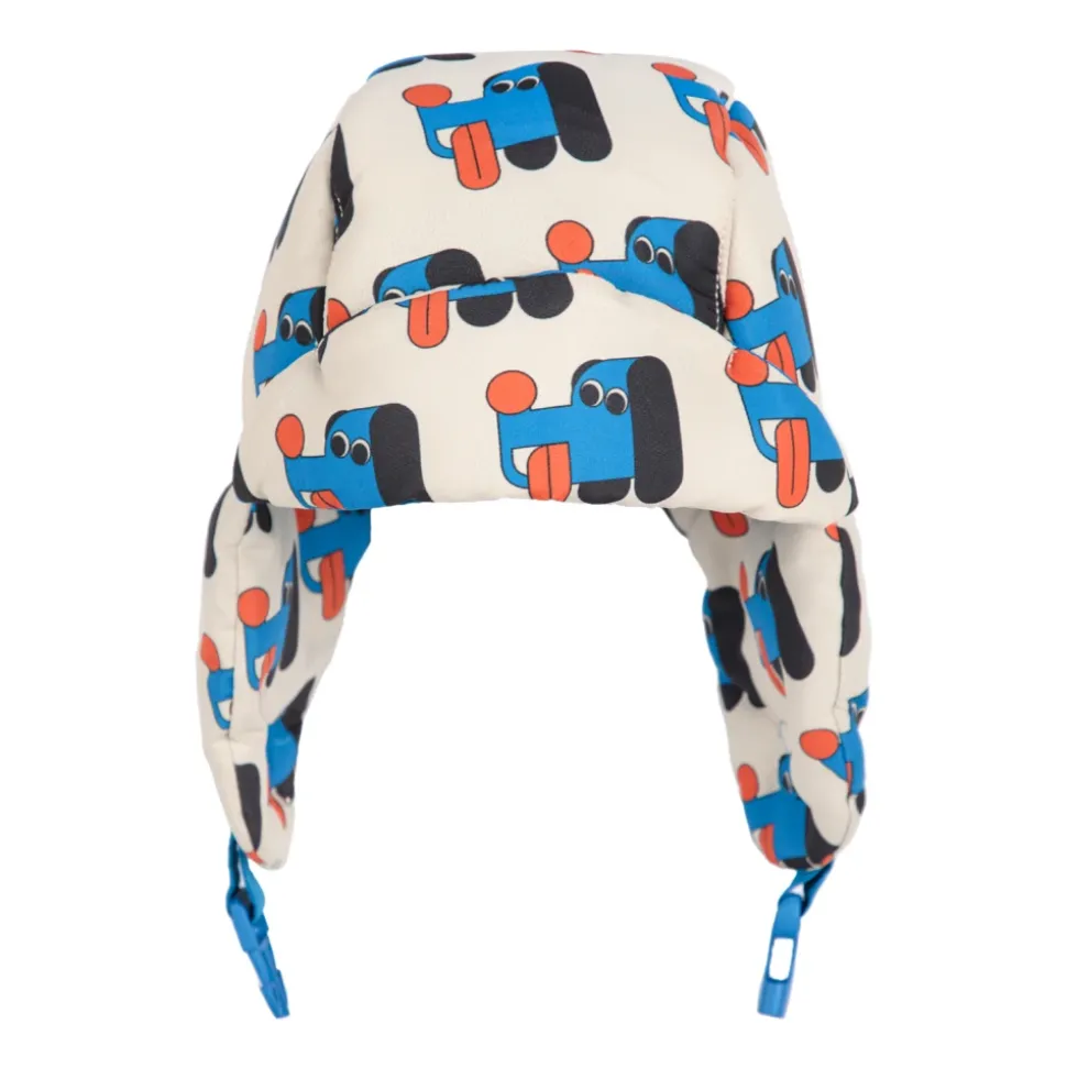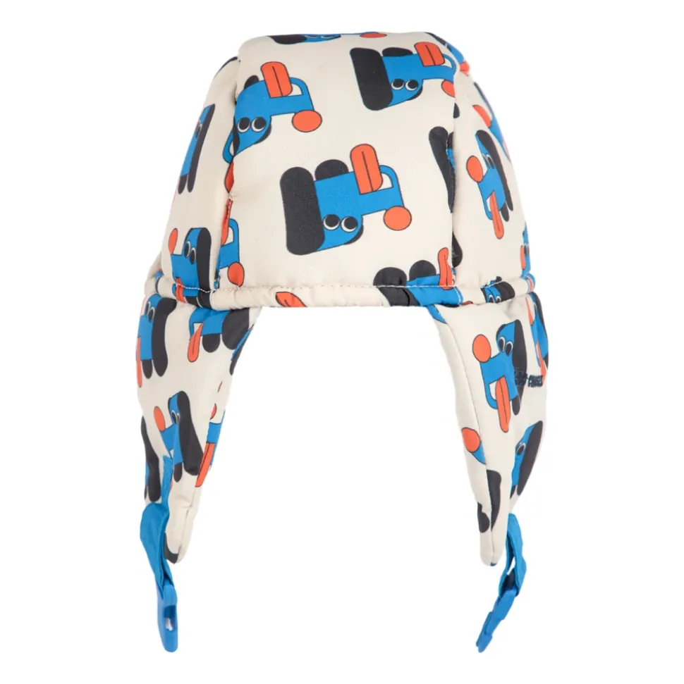 GEÏSOLEERDE HOED MET OORLAPPEN van Bobo Choses belichaamt verfijnde zorg voor het comfort en de stijl van de jongsten. Het klassieke trapper hoedontwerp omhult perfect het hoofd en de oren van het kind en biedt ongeëvenaarde bescherming tegen de kou. Het originele, energieke patroon met blauwe, zwarte en oranje motieven introduceert een speelse touch, waarbij de vreugde en openheid van een kind voor de wereld worden benadrukt. De uitzonderlijke buitenlaag van polyamide en polyester, zorgvuldig gestikte naden en de intens blauwe, zachte voering staan synoniem voor voortreffelijk vakmanschap en doordachte functionaliteit. De hoed wordt ook gekenmerkt door een tastbare zwarte