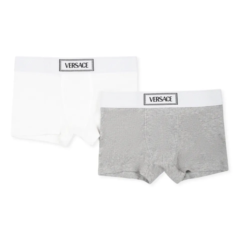 Kleed je kleintje in stijl met deze multicolor boxer set van Versace. Gemaakt van een geribbelde katoenmix, bevat deze set twee boxers in wit en grijs, elk met een elastische tailleband en een vintage Versace `90s logo op de voorkant. Belangrijkste kenmerken: Wit | Grijs | Multicolor | Katoen | Elastische tailleband | Vintage `90s logo | Samenstelling en onderhoud: 100% katoen | Machinewas op 30°C