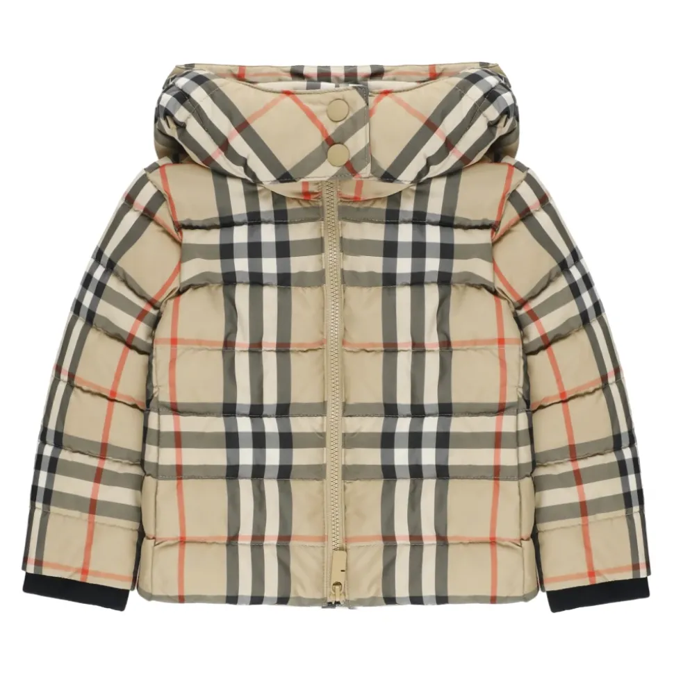 Blijf stijlvol en warm met deze beige Burberry donsjas voor jongens met een all-over Check patroon, capuchon, lange mouwen, twee zijdelingse steekzakken met drukknopen en ritssluiting aan de voorkant.