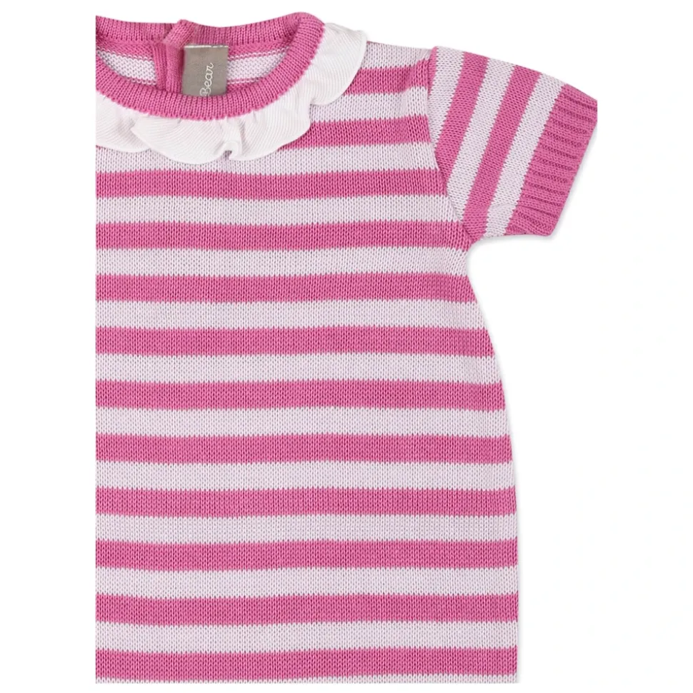 Kleed je kleintje in stijl met deze fuchsia gestreepte romper van Little Bear. Gemaakt in Italië van 100% katoen, deze romper heeft korte mouwen, ronde hals met ruches, knoopjes op de rug en tussen de benen, en geribbelde mouwen en enkels. Alleen handwas.
