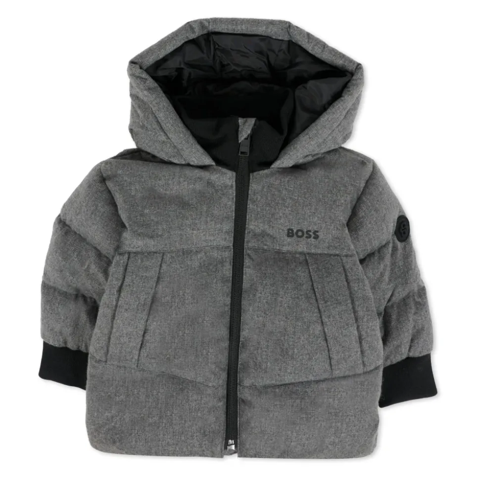 Houd je kleintje warm en stijlvol met deze Hugo grijze winterjas. Gemaakt van 100% polyester, is deze zware gewatteerde jas gevoerd en waterdicht, met lange mouwen, een capuchon, een ritssluiting aan de voorkant, zijzakken, geribbelde manchetten en een elastische zoom. Afgewerkt met een zwart logo op de borst en een rubberen logopatch op de mouw. Machinewasbaar op 30°C.