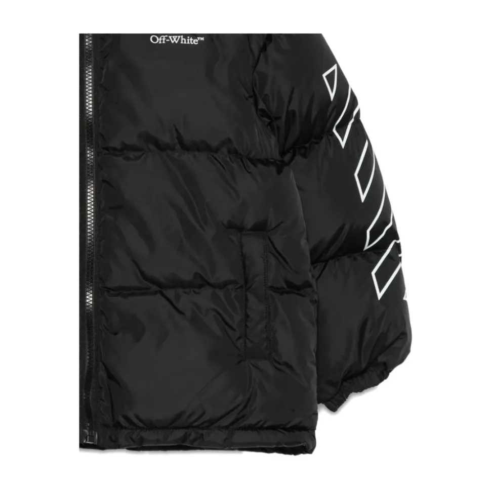 Blijf warm en stijlvol deze winter met deze zwarte Off White gewatteerde winterjas voor jongens. Voorzien van een capuchon, ritssluiting aan de voorkant, pijlprint mouwen en opgestikte zakken. Gemaakt van 100,0% nylon.