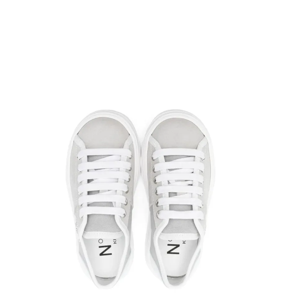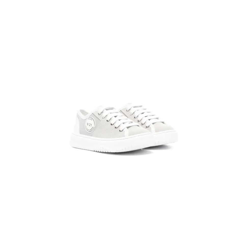 Upgrade de schoenencollectie van je kind met deze N21 grijze leren sneakers met een panelontwerp van kalfssuède, ronde neus, logopatch aan de zijkant, contrasterende hielkap, merkleren binnenzool, rubberen zool en vetersluiting aan de voorkant.