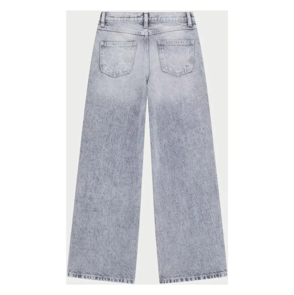 Verrijk de stijl van je kleine meid met deze Guess katoenen jeans. Voorzien van een klassiek 5-pocket model, palazzo pasvorm, hoge taille, wijde pijpen en ster-vormige strass details. Ritssluiting en knoopsluiting voor gemakkelijk dragen.
