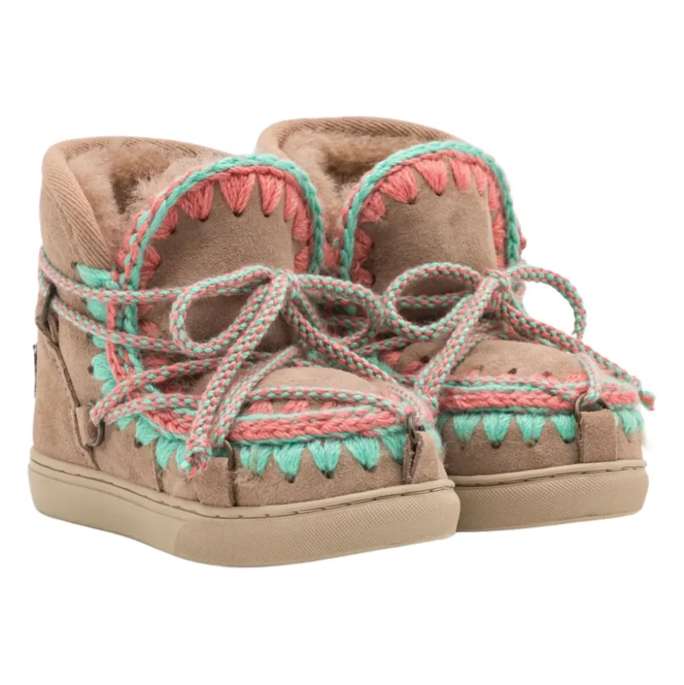 Mou Kids Eskimo beige suède laarzen voor meisjes, met de hand gemaakt van 100% wol met multicolor haaksteken, scoubidou veters, logopatch op de achterkant, gevoerde suède inlegzool, versterkte hiel, flexibele rubberen buitenzool.