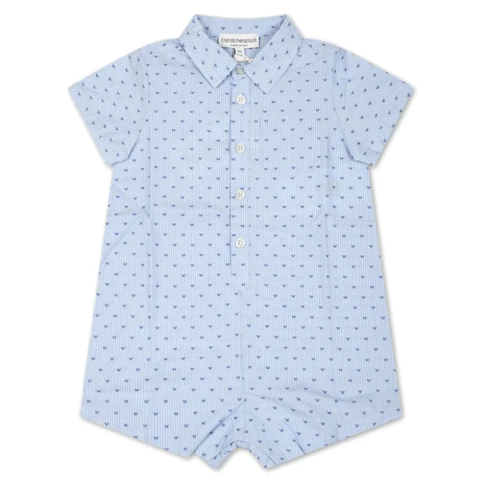 Emporio Armani presenteert de Hemelsblauwe Katoenen Romper, een stijlvolle keuze met een streepjesprint en een all-over logo ontwerp. Ideaal voor een klassieke look, deze romper heeft een kraag, knoopsluiting aan de voorkant en korte mouwen. Belangrijkste kenmerken: Blauw | Katoen | Klassieke kraag | Knoopsluiting aan de voorkant | Korte mouwen | Lengte tot op de dij |