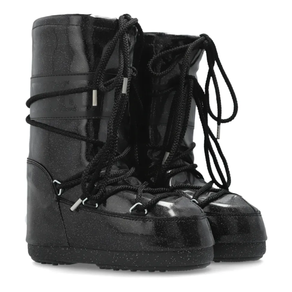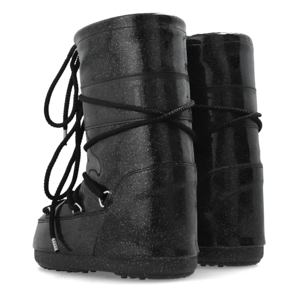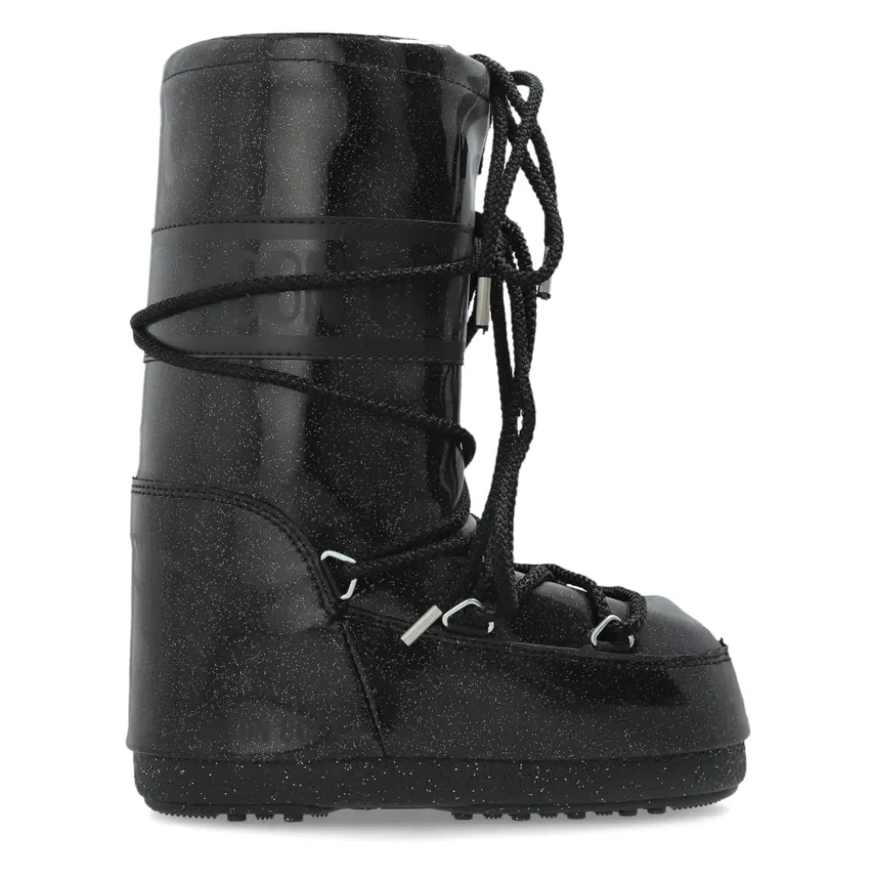 De Moon Boot Icon Glitter Snow Boot combineert een cilindrisch silhouet met glitter met een geïsoleerde constructie voor betrouwbare winterbescherming en zelfverzekerde grip in koude omstandigheden. Belangrijkste kenmerken: Zwart | Synthetisch | Waterafstotend bovenwerk | Isolerende voering | Antislip rubberen profielzool | Gekruiste buisvormige veters met metalen veterogen | Verstelbaar trekkoord aan de bovenkant voor een veilige pasvorm | Multisize schuimvoering voor adaptief comfort | Cilindrisch silhouet | Glitterafwerking | Paneel met logoprint | PVC-hielstuk en -afwerking | Wrap-around ontwerp | Afmetingen en pasvorm: Zoolhoogte: 4 cm | Multisize schuimvoering die na het dragen ontspant en zich naar de voet vormt | Samenstelling & verzorging: Bovenkant: Synthetisch (plastic/PVC) | Voering: Schuim / textiel | Zool: Thermoplastisch rubber | Afwerking: PVC | Hardware: Metalen veterogen