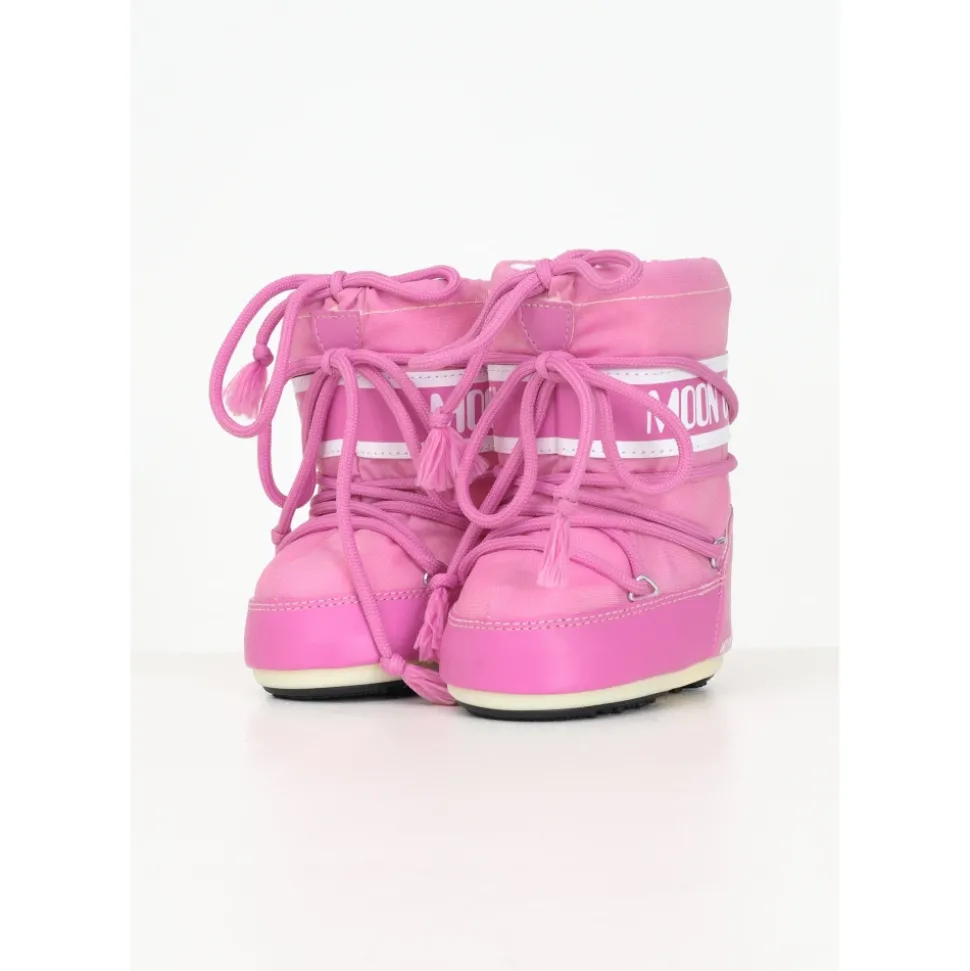 De Moon Boot ICON MINI Roze Baby Snowboots zijn ontworpen voor jonge avonturiers, met de iconische stijl van de originele Moon Boot uit 1969, aangevuld met isolerende vulling en een antislipzool voor een stevige grip. Belangrijkste kenmerken: Roze | Nylon | Waterafstotend | Antislipzool | Verstelbaar trekkoord | Hoog model | Wit logo op de achterkant | Afmetingen en pasvorm: Normale pasvorm | Samenstelling en onderhoud: Bovenkant: Polyamide 60% | Pvc 40% | Voering: Polyester 100% | Buitenzool: Tr Rubber 100% | Handwas aanbevolen