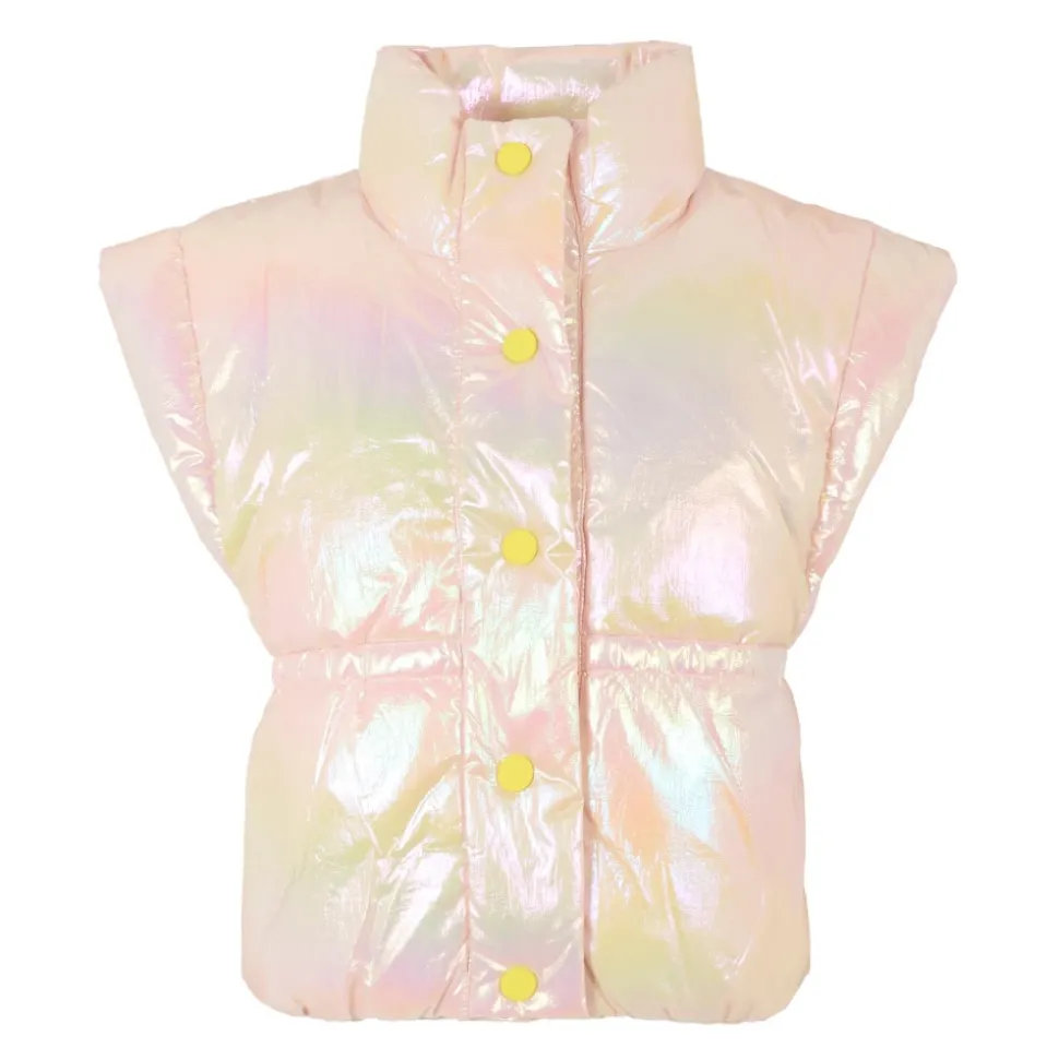 Upgrade de stijl van je kleintje met deze iriserende roze, gewatteerde en doorgestikte bodywarmer van Billieblush. Voorzien van een hoge kraag, sluiting aan de voorkant met drukknopen en elastische taille voor een comfortabele pasvorm. Gemaakt van 100% Modal. Machinewasbaar op 30°C.