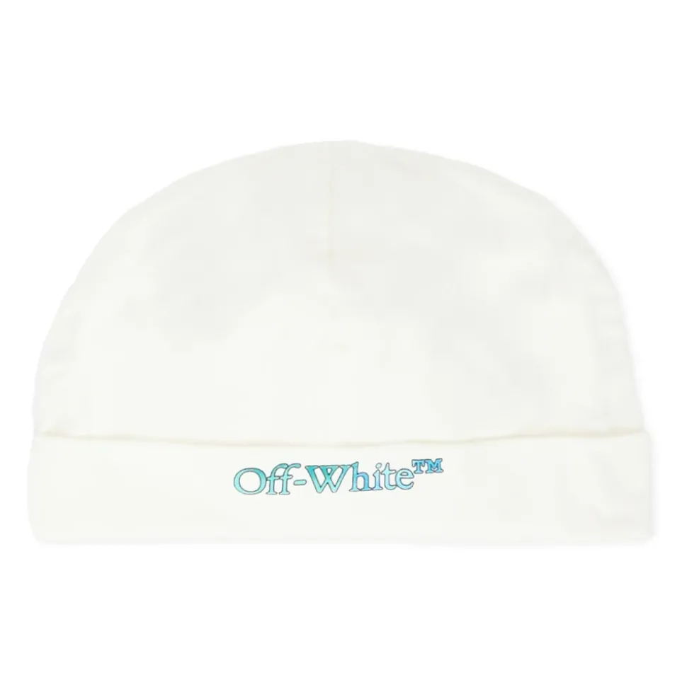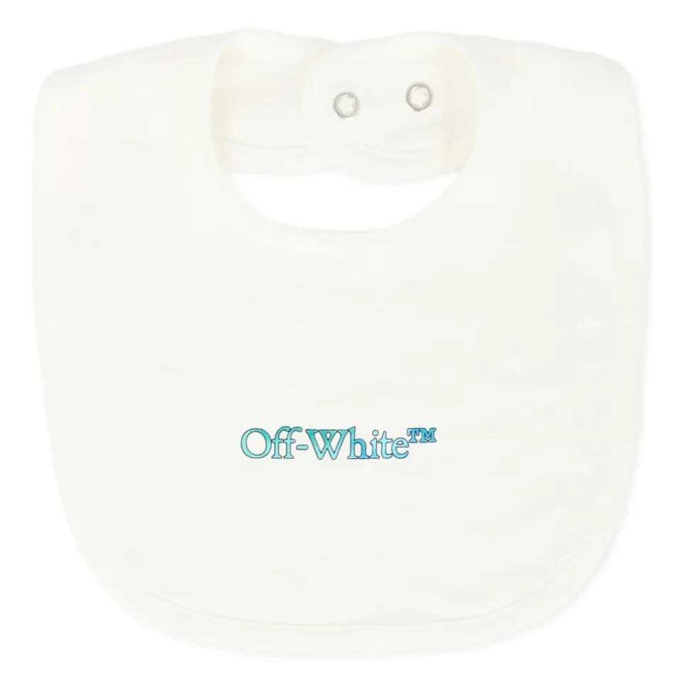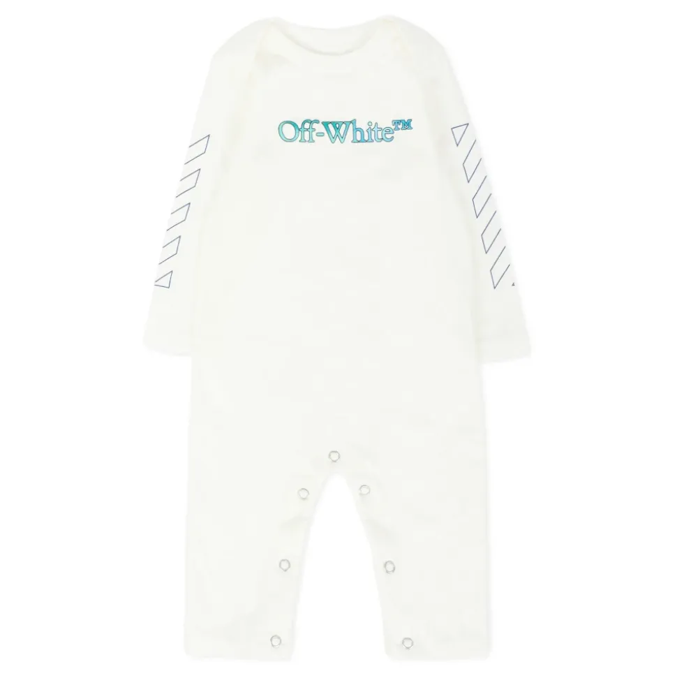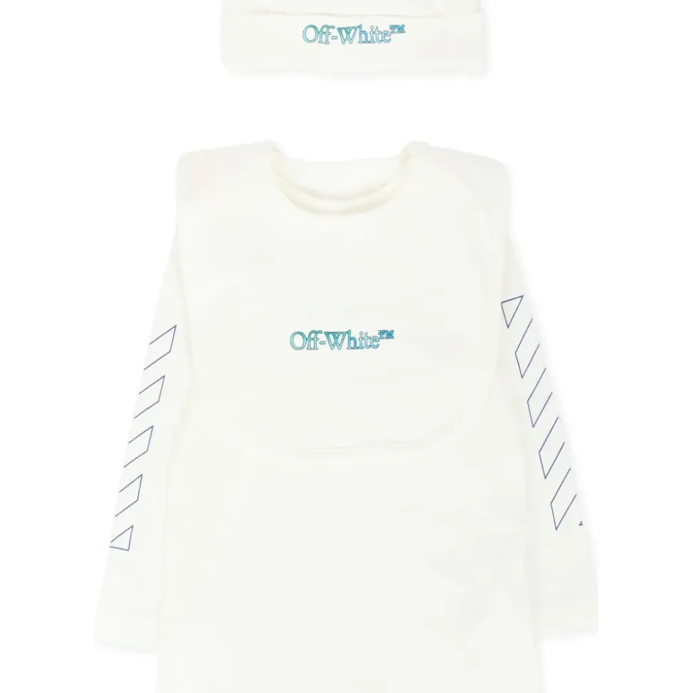 Kleed je kleintje in stijl met deze Off White ivoorkleurige babygrow set, inclusief een babygrow, slabbertje en muts. Gemaakt van 100% katoen, heeft de babygrow lange mouwen, een geribbelde ronde hals en drukknoopsluiting tussen de benen. Het set is versierd met een logoprint op de voorkant en iconische pijlen op de mouwen. Machinewasbaar op 30°C.