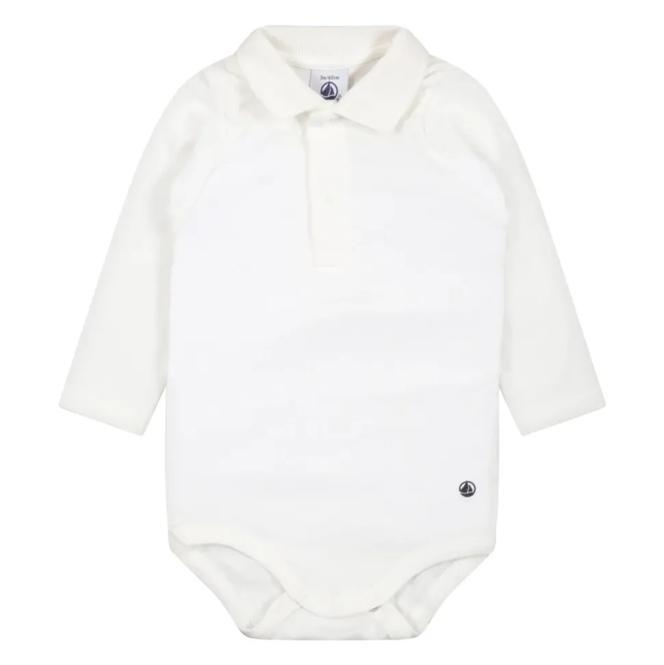 Petit Bateau Ivory Cotton Body voor kinderen met lange mouwen, klassieke kraag en drukknopen aan de voorkant en tussen de benen. Verfraaid met zijlogo details. Gemaakt van 100% katoen. Machinewas op 40°C.