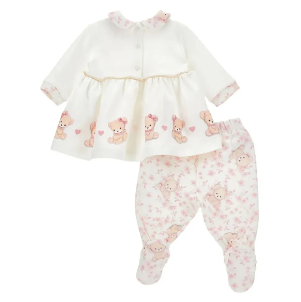 Kleed je kleine meisje in stijl met deze Monnalisa Ivory Cotton Birth Set. Deze set bevat een longsleeve t-shirt met een Peter Pan kraag, drukknoopsluiting en schattige teddybeerprint, samen met broekjes met een elastische taille en schattige teddybeer- en bloemenprints. Gemaakt van 100% katoen voor comfort. Machinewasbaar op 30°C.