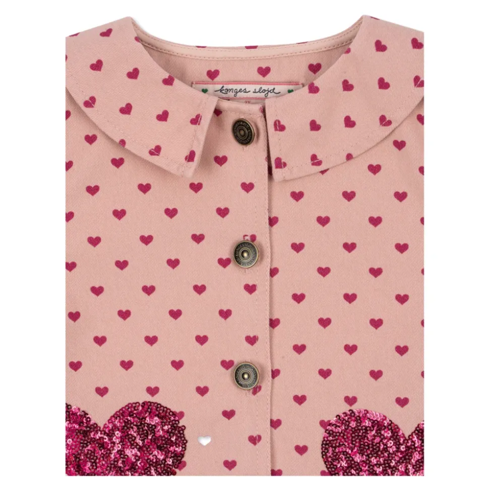 GEPATRONNEERDE JAS van Konges Sløjd is de essentie van moderne meisjesachtige subtiliteit. Dit model valt op door zijn EENVOUDIGE, LICHT UITLOPENDE SNIT en een afgeronde Peter Pan-kraag, die op harmonieuze wijze de delicatesse van een kind accentueert. De ruche afwerking bij de mouwen en aan de zoom voegt lichtheid en uitzonderlijke charme toe aan het geheel. De jas is versierd met een herhalende print van kleine, donkerroze hartjes en betoverende GLANZENDE PAILLETTENHARTEN aan de zijkanten, die de aandacht trekken en een vleugje elegantie toevoegen. De jas is gemaakt van KATOEN, wat opmerkelijke zachtheid en draagcomfort biedt, terwijl solide, licht glanzende metalen knopen zorgen voor een delicate finishing touch. WAAROM DIT PRODUCT KOPEN? * Natuurlijk, huidvriendelijk katoen * Universele, licht uitlopende pasvorm met een elegante ruche afwerking * Glanzende details die uniekheid en charme toevoegen * Aandacht voor detail – solide afwerkingen en een zorgvuldig ontworpen design * Origineel ontwerp van het gerenommeerde merk Konges Sløjd