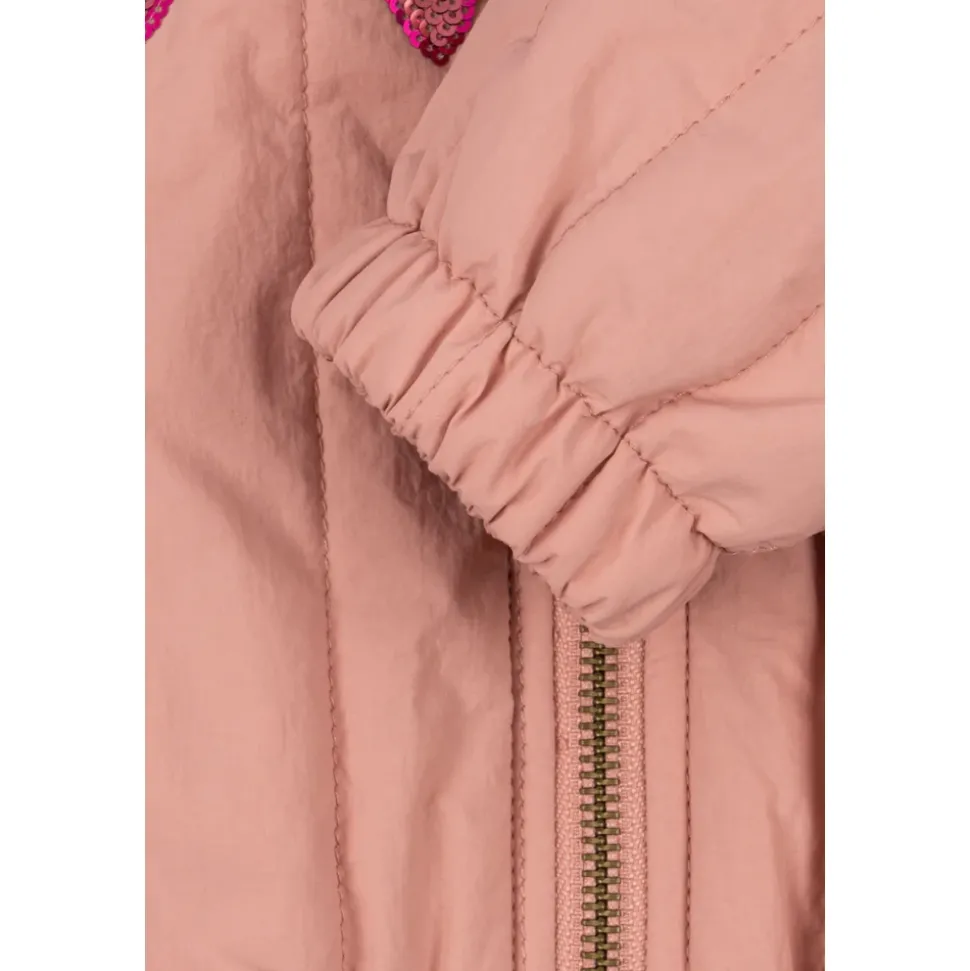 De Konges Sløjd Juno Bomber Jacket combineert een nylon buitenkant met een gewatteerde katoenen voering voor lichte isolatie en gemakkelijk dagelijks gebruik tijdens de overgangsseizoenen. Belangrijkste kenmerken: Roze | Nylon | Waterafstotend (BIONIC-FINISH® ECO) | Windbestendig | Lichte isolatie | | Gemakkelijk te onderhouden | Ritssluiting | Elastische manchetten, zoom en kraag | Gewatteerde voering voor zachte warmte | Raglanmouwen | Matte, gladde buitenlaag | Gewatteerde voering | Paillettenversieringen op de borst | Afmetingen en pasvorm: Klassieke losse pasvorm | Samenstelling en onderhoud: Hoofdmateriaal: 100% Nylon | Voering: 100% Katoen | Vulling: 100% Polyester | Machinewas op 30°C.