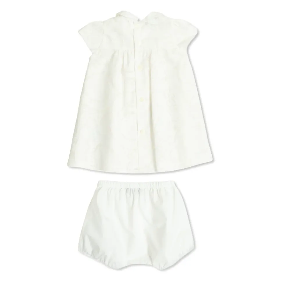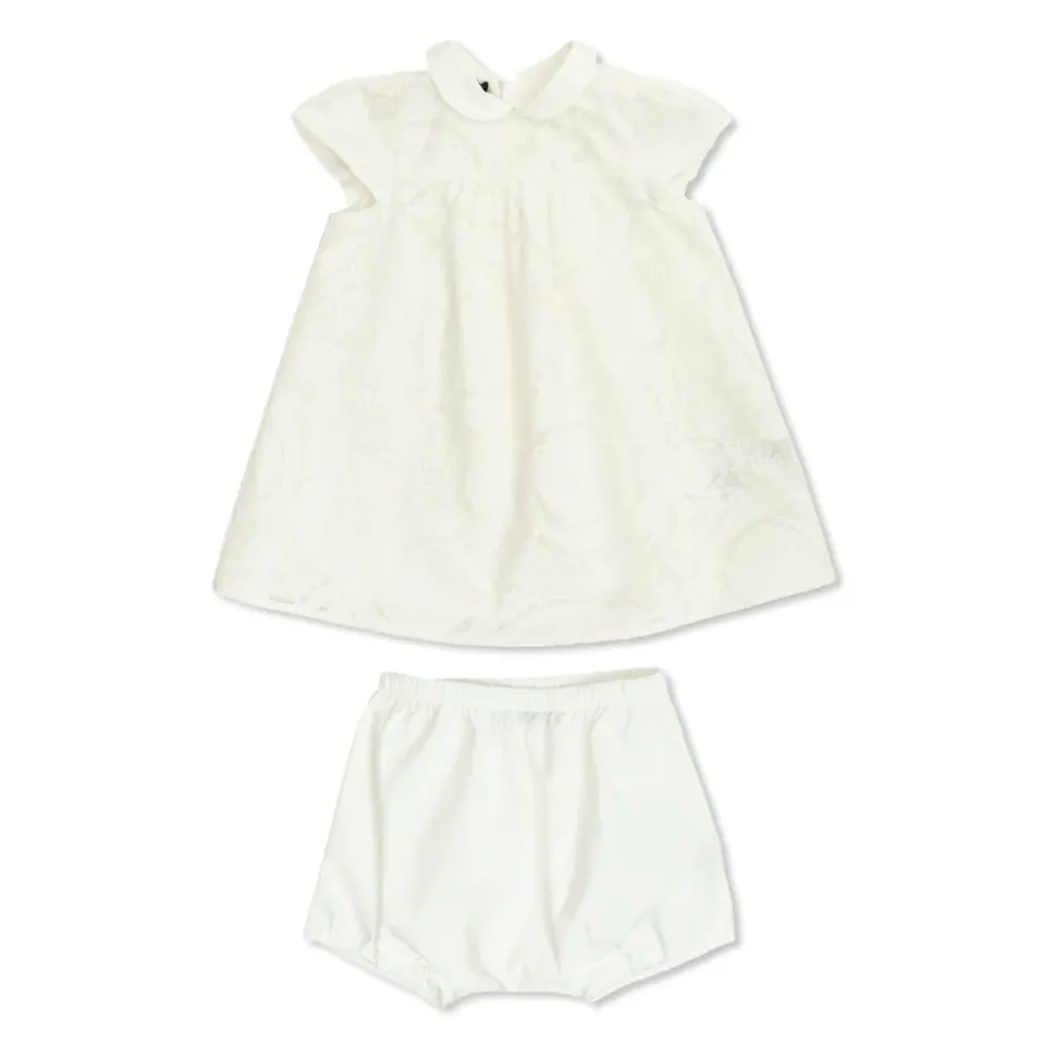 FLORAL MOTIF DRESS van Versace Kids belichaamt de essentie van verfijnde elegantie, ontworpen voor de jongste mode-enthousiastelingen. De klassieke uitlopende silhouet harmonieert met subtiele voorplooien, waardoor het hele stuk een nobele volume krijgt die kenmerkend is voor topklasse babyjurken. Het ingewikkelde bloemenpatroon in een consistente kleurenpalet benadrukt de prestige en onderscheidend vermogen van deze creatie. De gladde, hoogwaardige stof met een discrete textuur zorgt voor comfort en delicatesse – zo belangrijk voor de gevoelige huid van een kind. De versiering is een klassieke kraag gemaakt van uniform materiaal, terwijl de achterkant sluiting met kleine knopen het aankleden gemakkelijk maakt. De uniekheid van het model wordt verder versterkt door ambachtelijke aandacht voor detail, wat echt onschatbaar is. WAAROM DIT PRODUCT KIEZEN? * Uitzonderlijk, luxueus karakter ondertekend door Versace Kids * Perfecte pasvorm voor de silhouet van een baby * Nobel stof zorgt voor opmerkelijk comfort * Praktische sluiting voor gemakkelijk verschonen * Uniek patroon en elegante afwerkingen