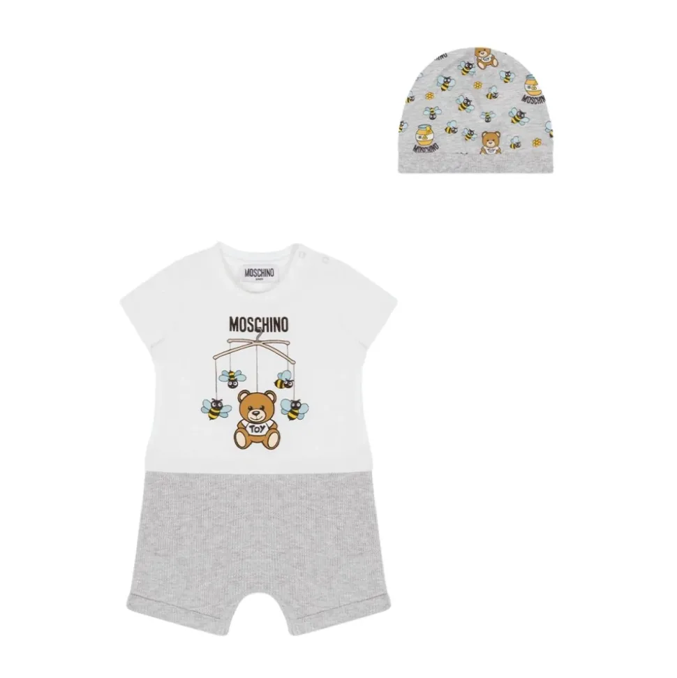 Moschino Katoenen Romper & Hoed Geschenkset combineert een gedrukt Teddy speelgoedmotief met praktische details voor het gemakkelijk aankleden. De set benadrukt een lichtgewicht romper met drukknoopsluitingen en een bijpassende hoed voor dagelijks gebruik. Belangrijkste kenmerken: Multicolor | Wit | Grijs | Katoen | Lichtgewicht | Drukknoopsluiting in de hals | Drukknoop/clip voor snelle luierwissels | Inclusief bijpassende hoed | Ronde halslijn | Halflange mouwen | Teddy speelgoedprint met bijen | Grijs piqué onderste gedeelte | Samenstelling & onderhoud: 100% Katoen | Machinewas op 30°C. Niet strijken. Niet wassen met lichte kleuren. Gebruik geen bleekmiddel. Gemaakt in Portugal.