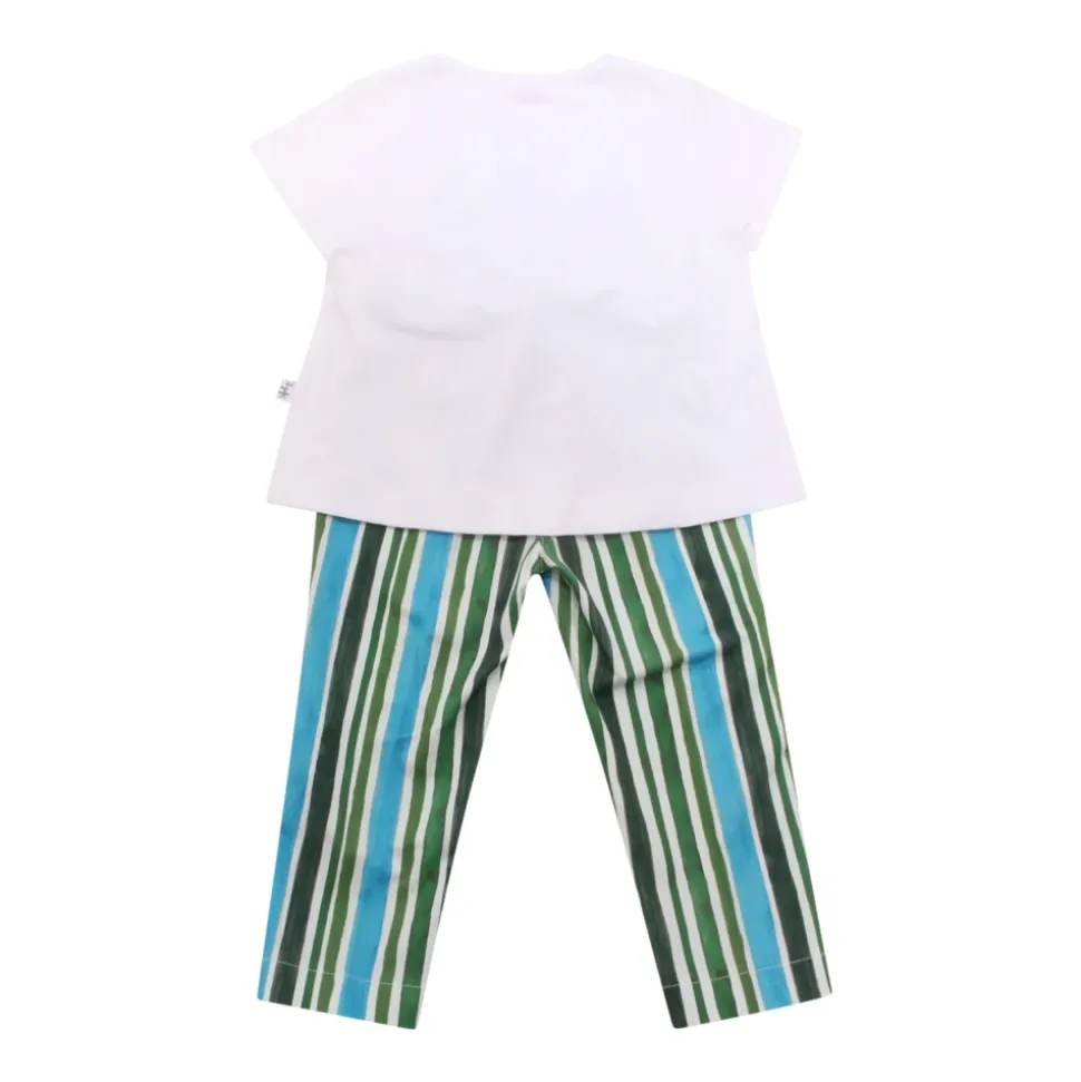 Kleed uw kleintje in stijl met deze Il Gufo set, vervaardigd in Italië. Deze set bestaat uit een wit T-shirt met een opvallend groen design aan de voorkant en zijsplitten, gecombineerd met blauw-wit-groen gestreepte broek voor een gecoördineerde look. Belangrijkste kenmerken: Wit | Groen | Blauw | Katoen | Zijsplitten | Gestreepte broek | Afmetingen en pasvorm: Normale pasvorm | Samenstelling en onderhoud: 100% Katoen | Machinewas koud, droogtrommel laag.