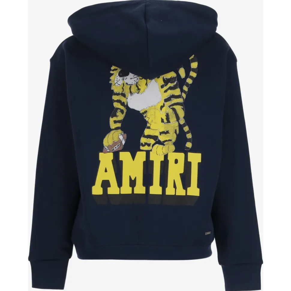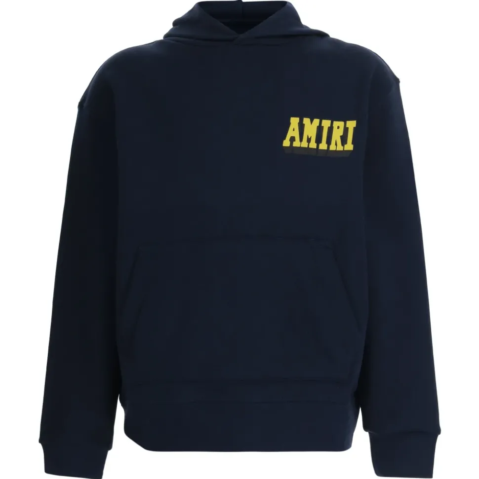 Amiri Kids Navy en Gele Katoenen Sweatshirt met Capuchon en Contrasterend Logodetail. Gemaakt in Italië. Perfect voor jongens van 8 jaar. Hoogwaardige katoenen sweatshirt met lange mouwen, achterprint, geribbelde randen en rechte zoom.