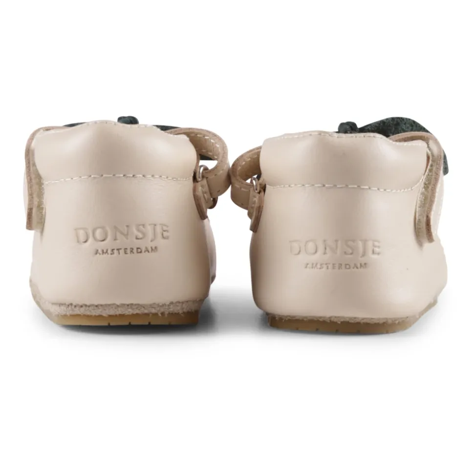 Donsje roze binnenschoenen voor meisjes, gemaakt van zacht leer met suède zool, band, klittenbandsluiting en ronde neus. Versierd met kersen aan de voorkant en logo aan de achterkant. Gemaakt van 100% leer.