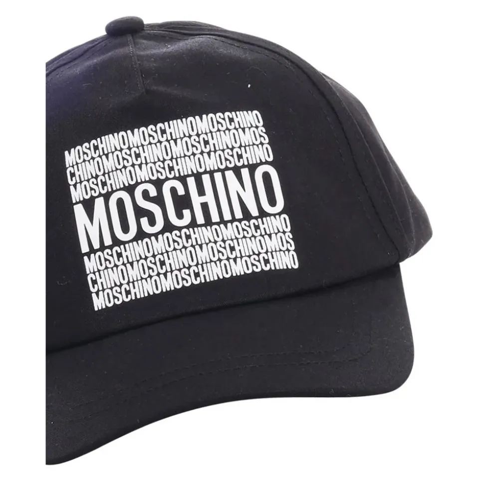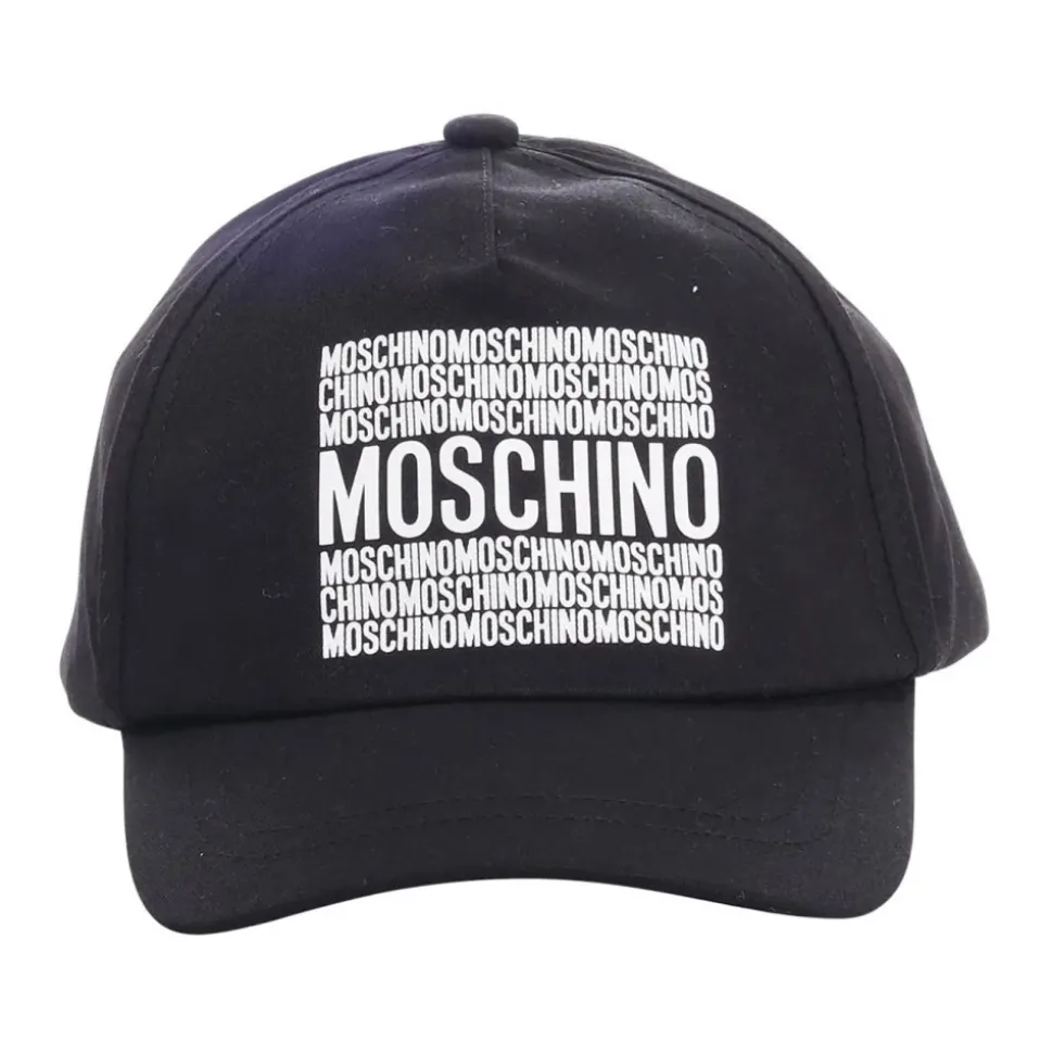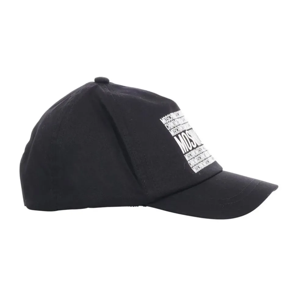 Moschino pet met contrasterende, herhaalde logo-letters op de voorkant en een verstelbare band voor een comfortabele, aanpasbare pasvorm. Belangrijkste kenmerken: Zwart | Nero | Katoen | Verstelbare klittenbandsluiting | Contrasterende, herhaalde logo-letters op de voorkant | Afmetingen en pasvorm: One size met verstelbare sluiting | Samenstelling en verzorging: 100% Katoen | Vermijd stomen, drogen in de droogtrommel en bleken. Strijk op max. 110°C zonder stoom (droog strijken). Gebruik wasmiddel voor gekleurde kleding en volg het wasvoorschrift op het kledingstuk.