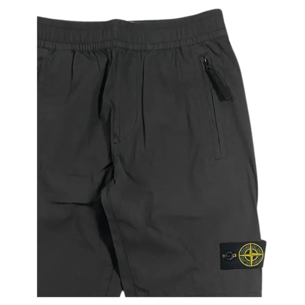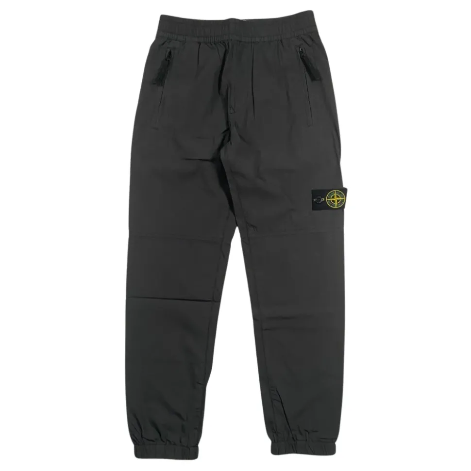 Stone Island Kids grijze katoenen en nylon broek met een elastische tailleband en interne trekkoord, twee zijzakken met rits, een grote centrale achterzak met drukknopen, elastische manchetten en een regular fit. Samenstelling: 74% katoen, 26% polyester. Gemaakt in Italië.