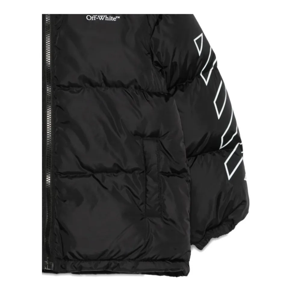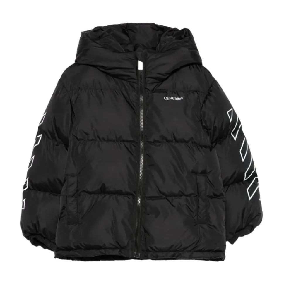 Blijf warm en stijlvol met deze Off White Kids Black gewatteerde jas met capuchon en logo. Perfect voor jongens tijdens het winterseizoen.