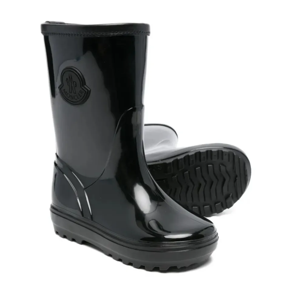 Moncler zwarte regenlaarzen voor kinderen met logo embleem, ronde neus en treklip.