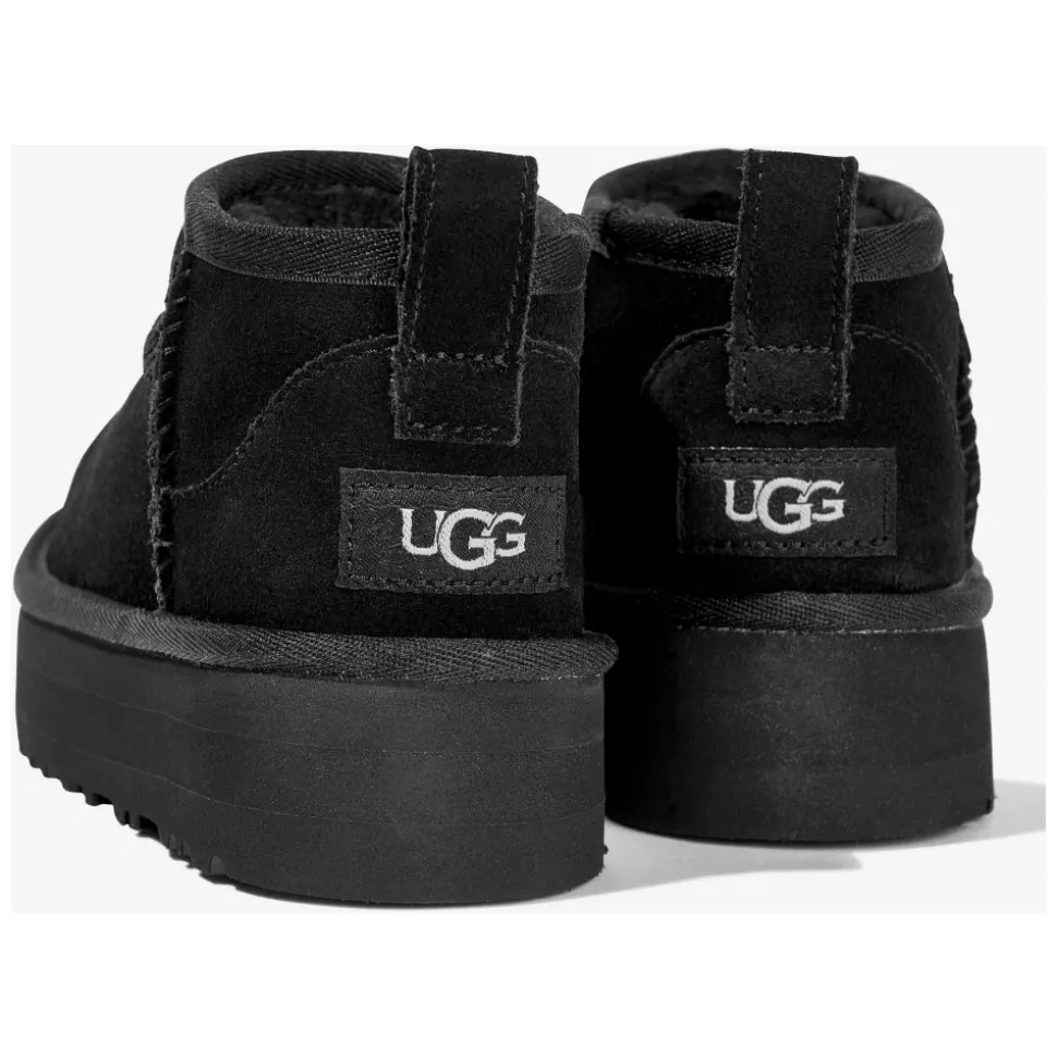 Verhoog de stijl van je kleintje met deze strakke UGG ultra mini platform zwarte laarzen. Gemaakt van hoogwaardig suède en voorzien van een asymmetrische bovenrand, tonen deze laarzen het innovatieve ontwerp en vakmanschap van UGG. Compleet met een schuimvoetbed en EVA Sugarcane buitenzool voor comfort en stijl. Inclusief achterste aantreklip, UGGplush™ wol en TENCEL™ lyocell voering en binnenzool, en geweven hiel label met UGG® logo.