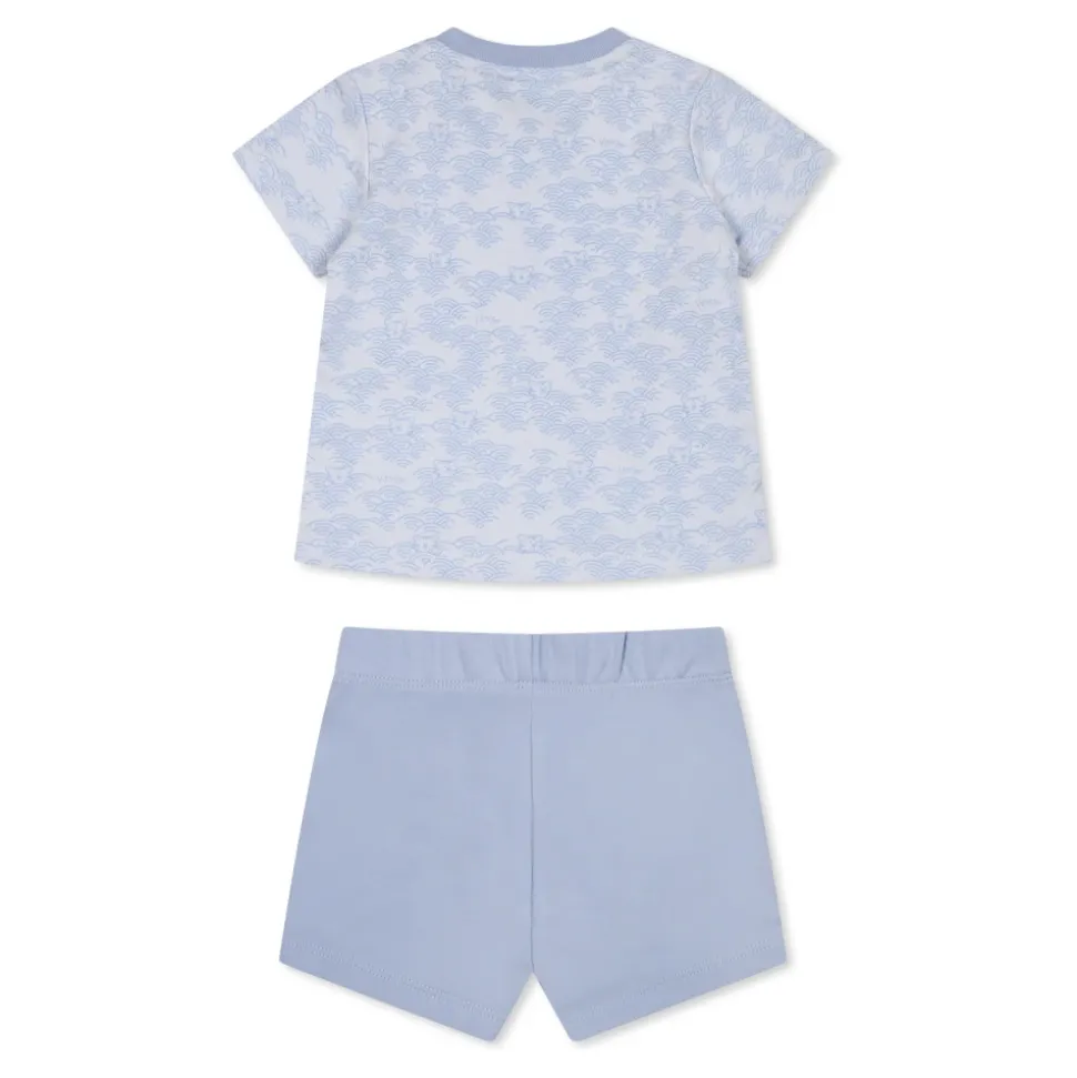 Kleed je kleintje in stijl met dit lichtblauwe pak van het Franse merk Kenzo Kids. Gemaakt van 100% katoen, deze set bevat een korte mouwen t-shirt met een geribbelde ronde hals en drukknoopsluiting, met een all-over tijgerprint en logo detail. De shorts hebben een elastische taille en een logo aan de voorkant. Machinewasbaar op 30°C.