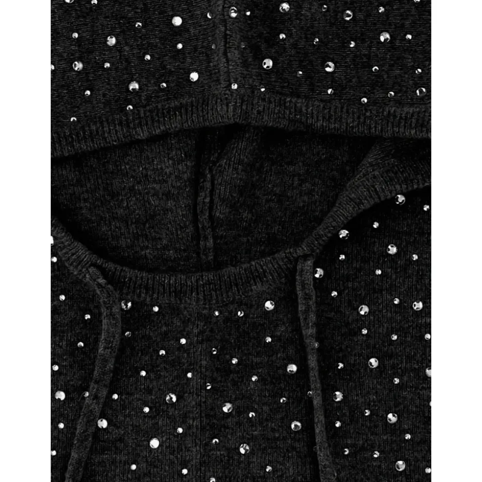 Verrijk de stijl van je kleine meisje met deze PINKO zwarte wollen trui met trekkoord capuchon, versierd met kristallen en gebreide geribbelde randen. Perfect om een vleugje glamour aan haar outfit toe te voegen!