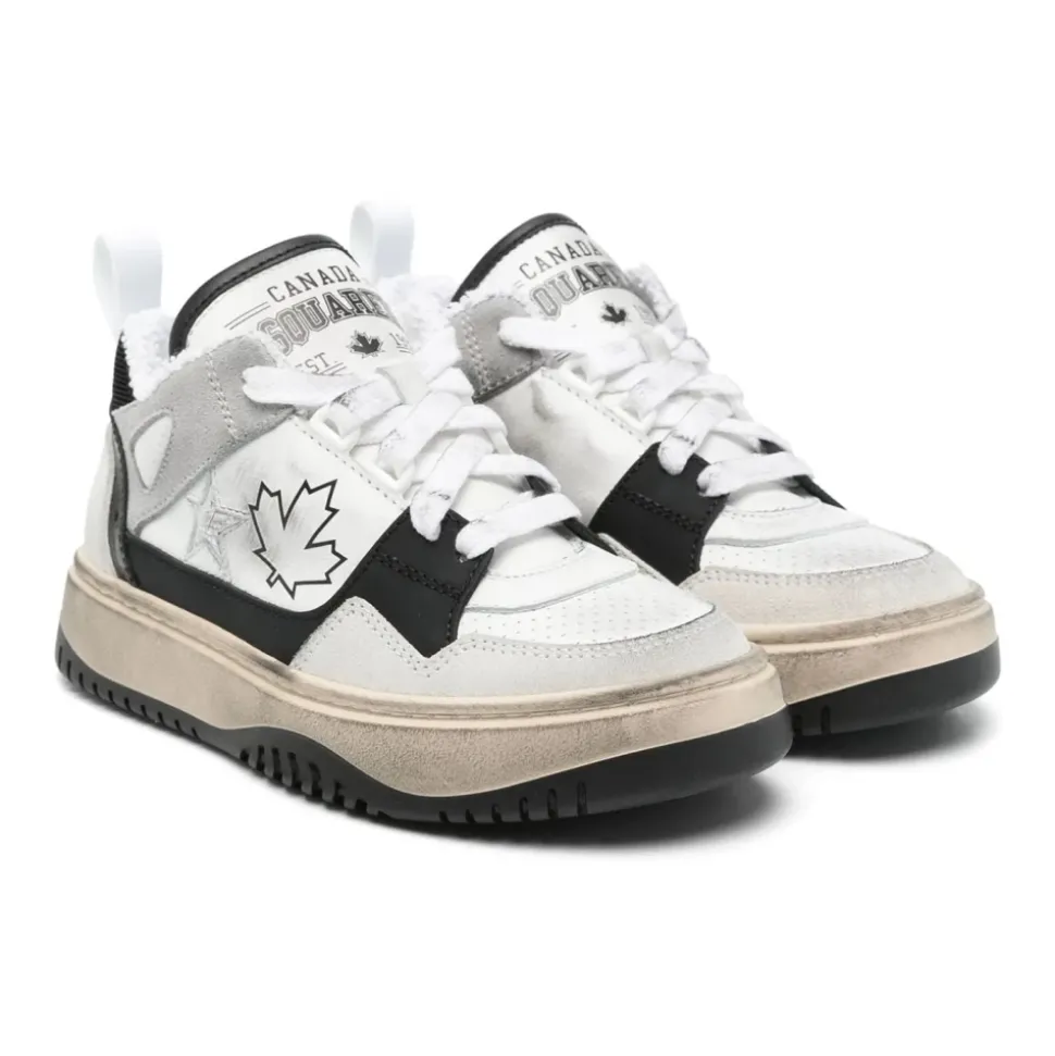 Dsquared2 Lage Sneakers met Veters combineren een vintage logo op de tong met een strak, alledaags silhouet, waarbij comfort en kenmerkende design details in balans zijn. Belangrijkste kenmerken: Wit | Bianco | Kalfsleer | Comfortgerichte constructie | Vetersluiting | Laag silhouet | Tong versierd met vintage logo | Samenstelling & onderhoud: Bovenkant: 94% kalf, 2% geit, 4% polyester | Voering: 80% katoen, 20% polyester | Binnenzool: 100% kalf | Zool: 100% thermoplastisch rubber | Niet chemisch reinigen. Niet in de droogtrommel. Niet bleken. Strijk op max. 110°C zonder stoom. Gebruik een kleurveilig wasmiddel en volg het wasetiket.
