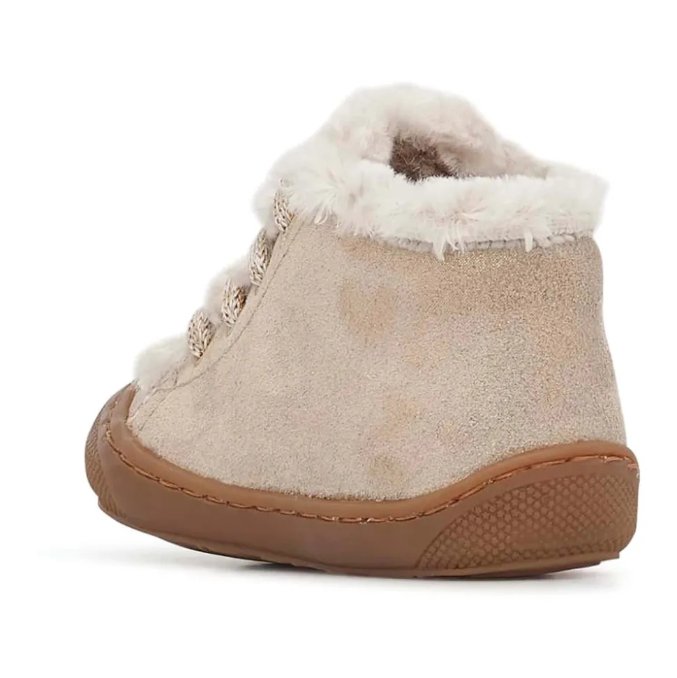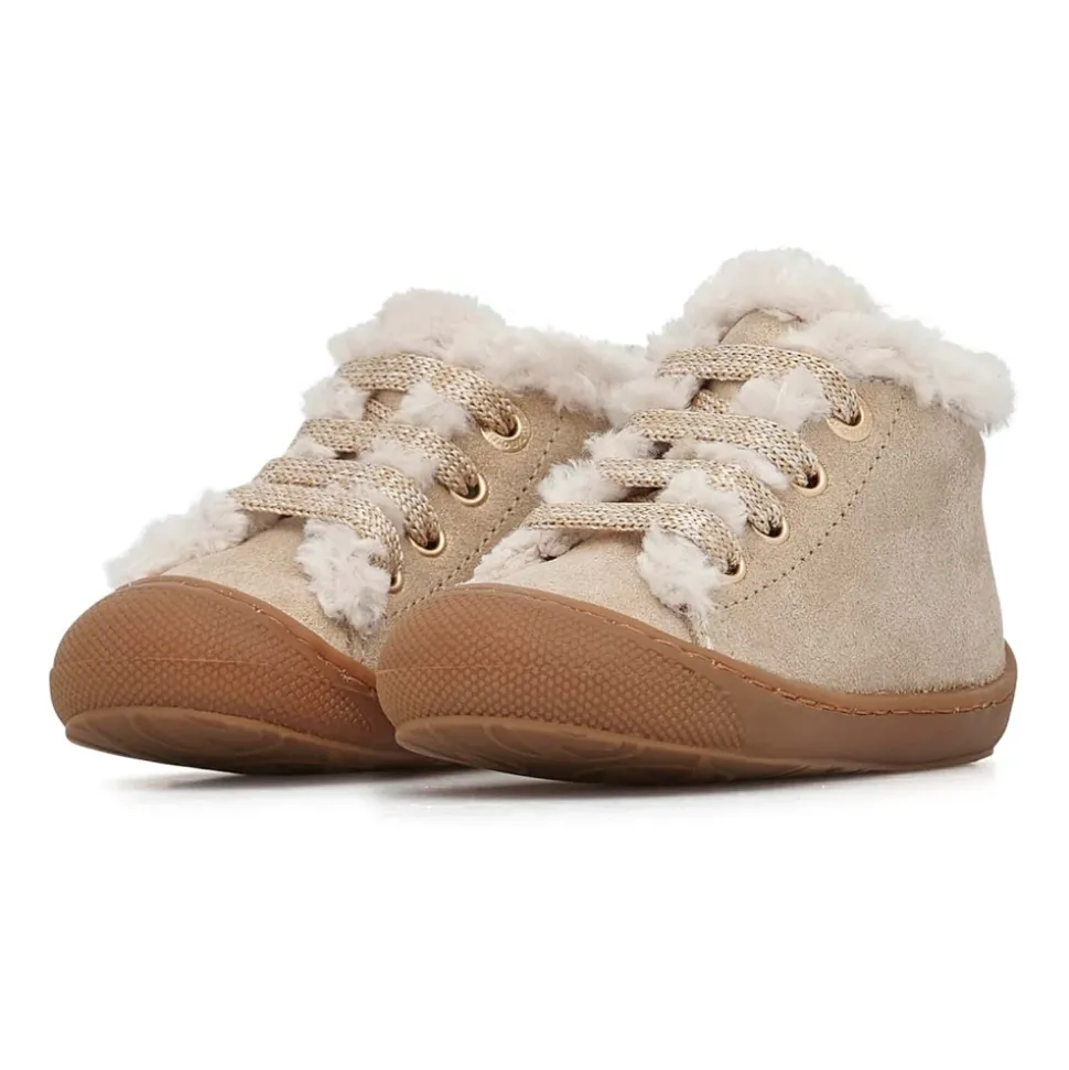 Naturino LALLIT combineert een glitterend suède bovenwerk met wollen details voor een knusse, stijlvolle eerste-stapjes schoen. Het combineert een ondersteunende constructie en een antislipzool om vroege lopers te helpen beschermen en stabiliseren. Belangrijkste kenmerken: Goud | Suède en wol | Antislip rubberen zool | Verstevigde neus voor duurzaamheid | Vetersluiting met lurex veters | Leren binnenzool | Glitterend suède bovenwerk | Wollen inzetstukken aan de bovenrand | Gestructureerde hiel | Samenstelling & onderhoud: Suède | Wol | Leer | Rubber | Lurex
