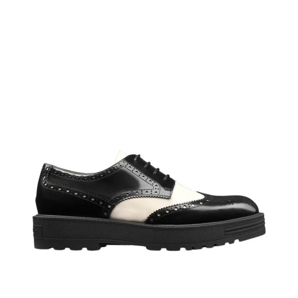 Dior leren derbies zijn vervaardigd uit glad kalfsleer met geperforeerde details voor een verfijnde, formele look. De klassieke derbyconstructie met vetersluiting maakt ze geschikt voor nette en smart-casual outfits. Belangrijkste kenmerken: Multicolor | Zwart | Kalfsleer | Vetersluiting aan de voorkant | Leren voering | Leren binnenzool | Leren zool | Ronde neus | Geperforeerd detail | Derby silhouet | Samenstelling & verzorging: 100% kalfsleer | Binnenkant: Leer | Binnenzool: Leer | Zool: Leer